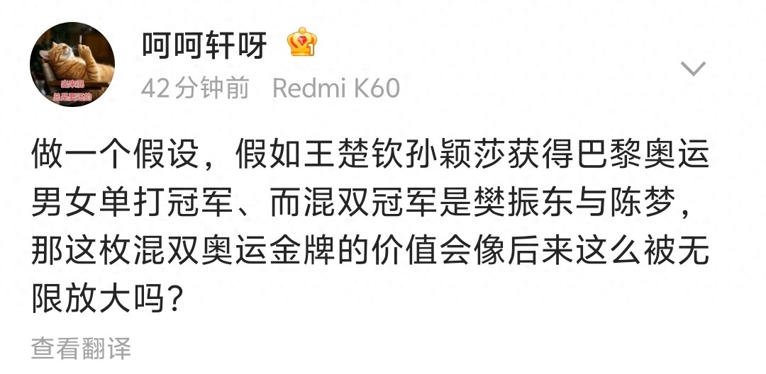 不同的奥运会周期竞争形势不一样,上个奥运会周期孙颖莎和王楚钦参加混双比赛夺得了冠军,确实付出了很多努力。球迷认为这两个人是因为参加混双比赛分散了比赛精力,从而导致奥运会单打没有夺冠。这个奥运会周期所有参赛的选手都要身兼多项,所有的选手都处于同一起跑线,也不只有莎头二人身兼多项。