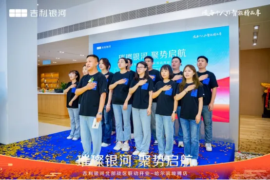 剪彩环节结束后,现场进行了揭牌环节,并由哈尔滨峻搏店的销售团队进行集体宣誓,展现他们“始于用户需求,忠于用户满意”的坚定信念,标志着峻搏体验中心获得吉利银河品牌销售与服务体系的官方认证,成为重要的战略合作伙伴。