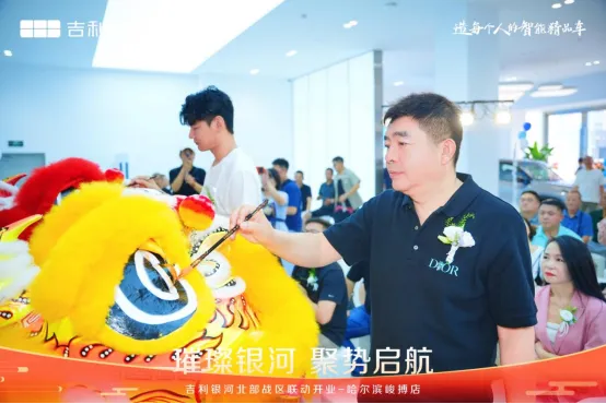 四海征程虎跃龙腾,瑞狮欢舞歌盛世。舞狮点睛环节,吉利汽车销售公司吉利银河城市运营经理杨晓炜与黑龙江成越汽车集团董事长玉立坤共同点醒瑞狮,将吉祥如意、兴旺发达的美好寓意注入新店。点睛后的祥狮生龙活虎,象征着哈尔滨峻搏体验中心未来必将宏图大展,客似云来。