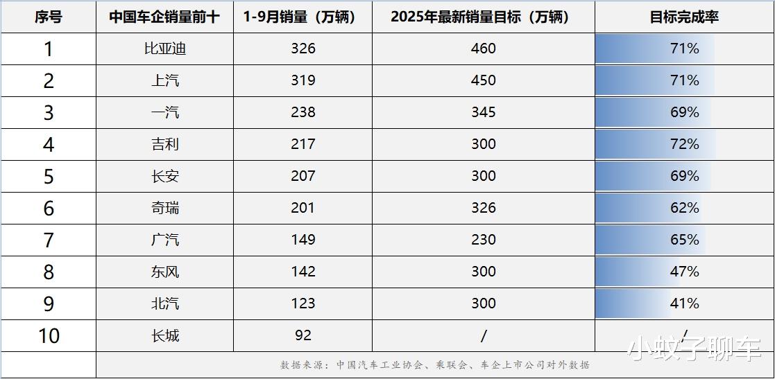 从销量前十车企来看,比亚迪和上汽集团处于行业头部,1-9月累计销量均已超300万辆。其中,排名第一的比亚迪1-9月销量达326万辆,已完成全年460万辆最新销量目标的71%,持续巩固其无可撼动的领先地位。