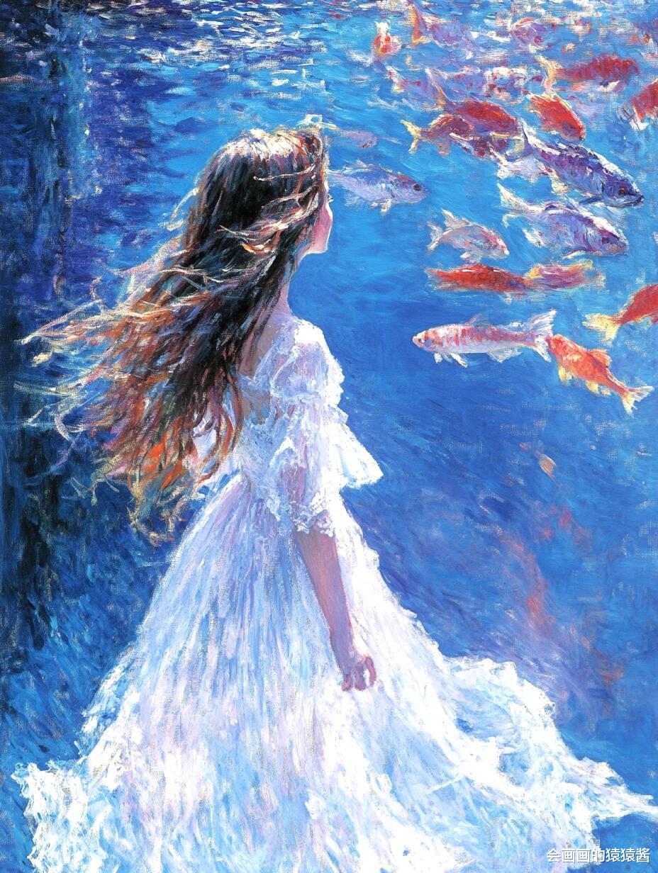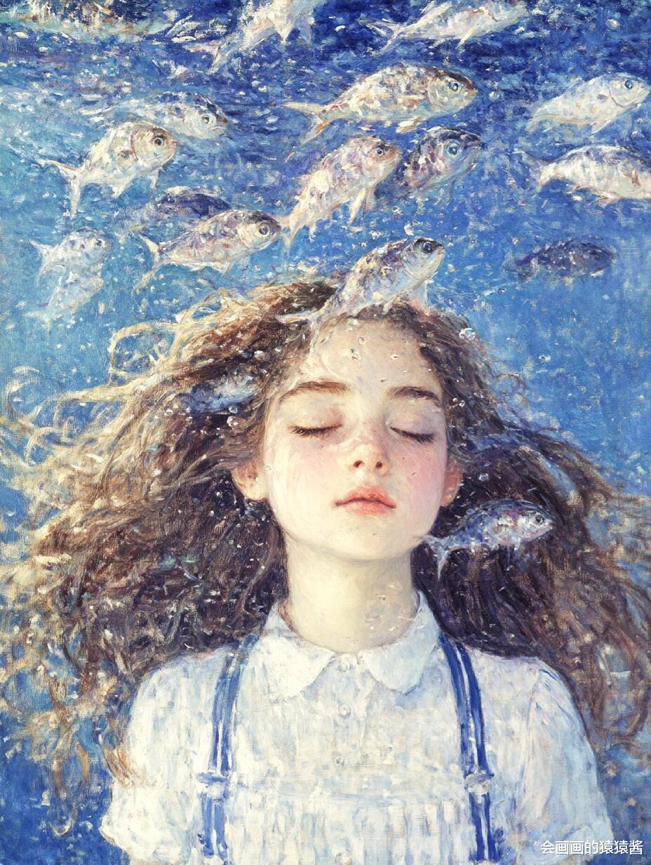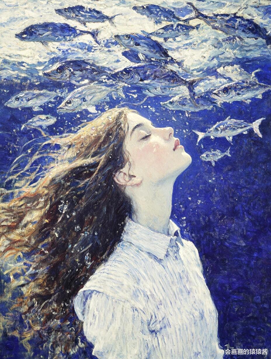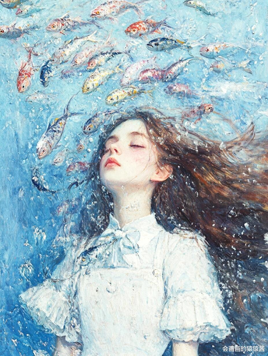 核心是精准还原水下光影与油画质感:先通过「厚涂笔刷强化」节点,用堆叠笔触模拟传统油画的颗粒肌理,让发丝的蓬松感、水面的波光更有层次;再用「水下光影模拟」节点,还原阳光穿透水面的丁达尔效应,让人物皮肤、发丝呈现自然的水波纹光影折射;接着用「色彩分层控制」节点,锁定清透蓝调主色,搭配鱼群的缤纷色彩,保证画面通透不沉闷;最后用「构图锚点引导」节点,将少女置于视觉中心,让鱼群与水面形成自然延伸,强化画面纵深感。