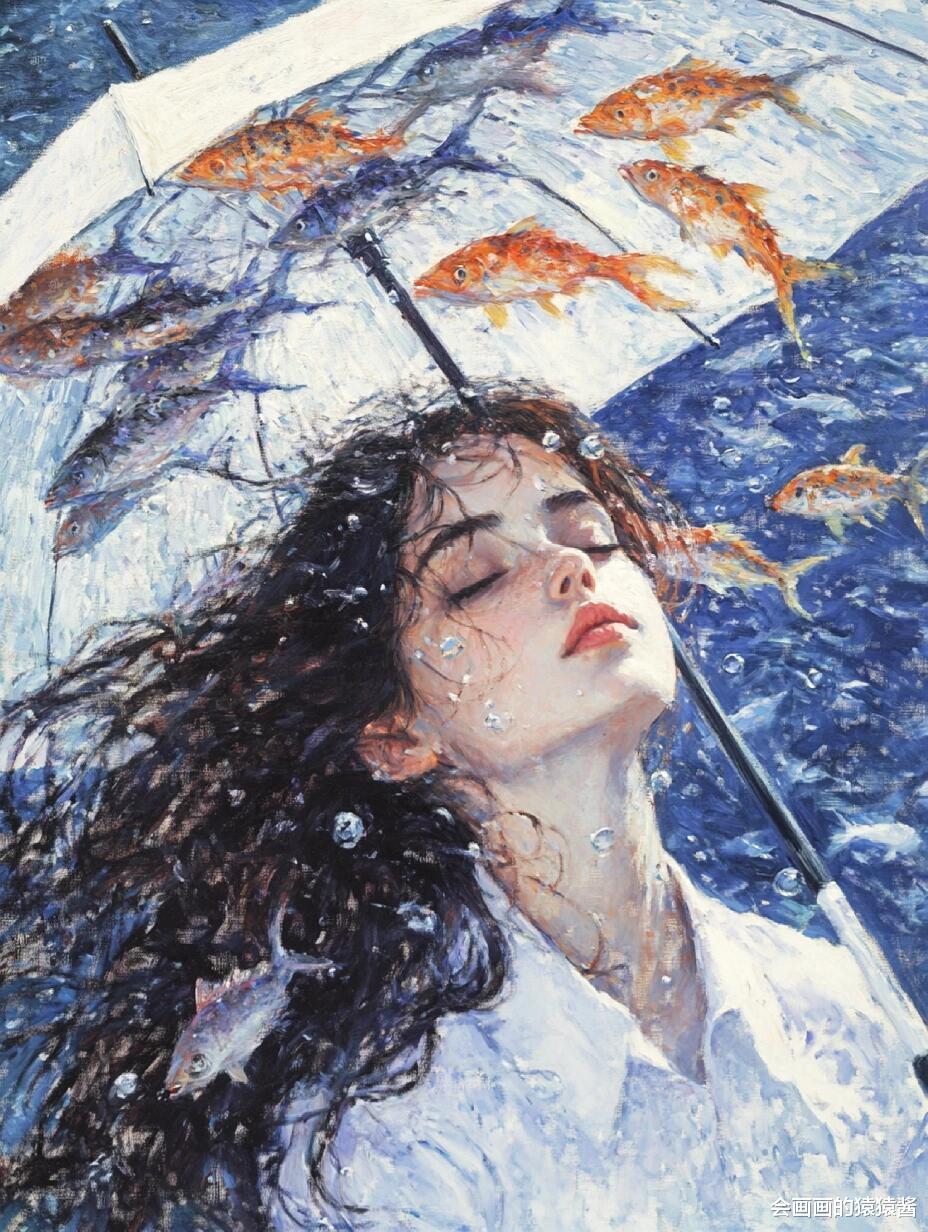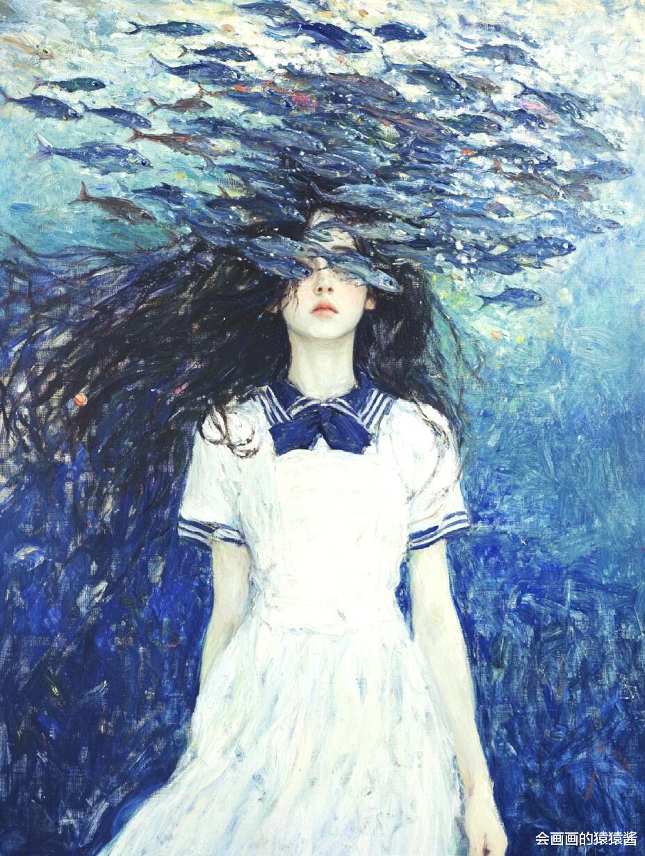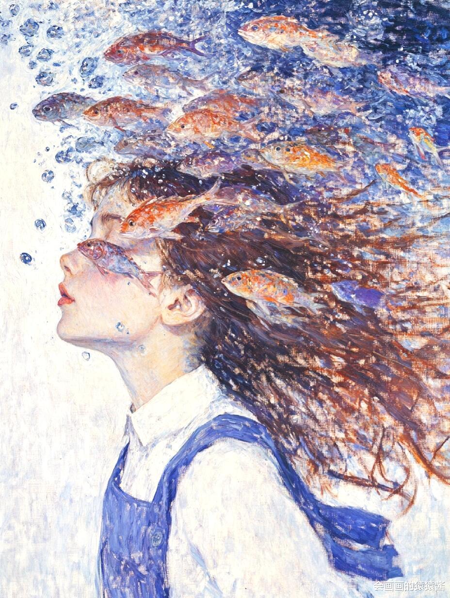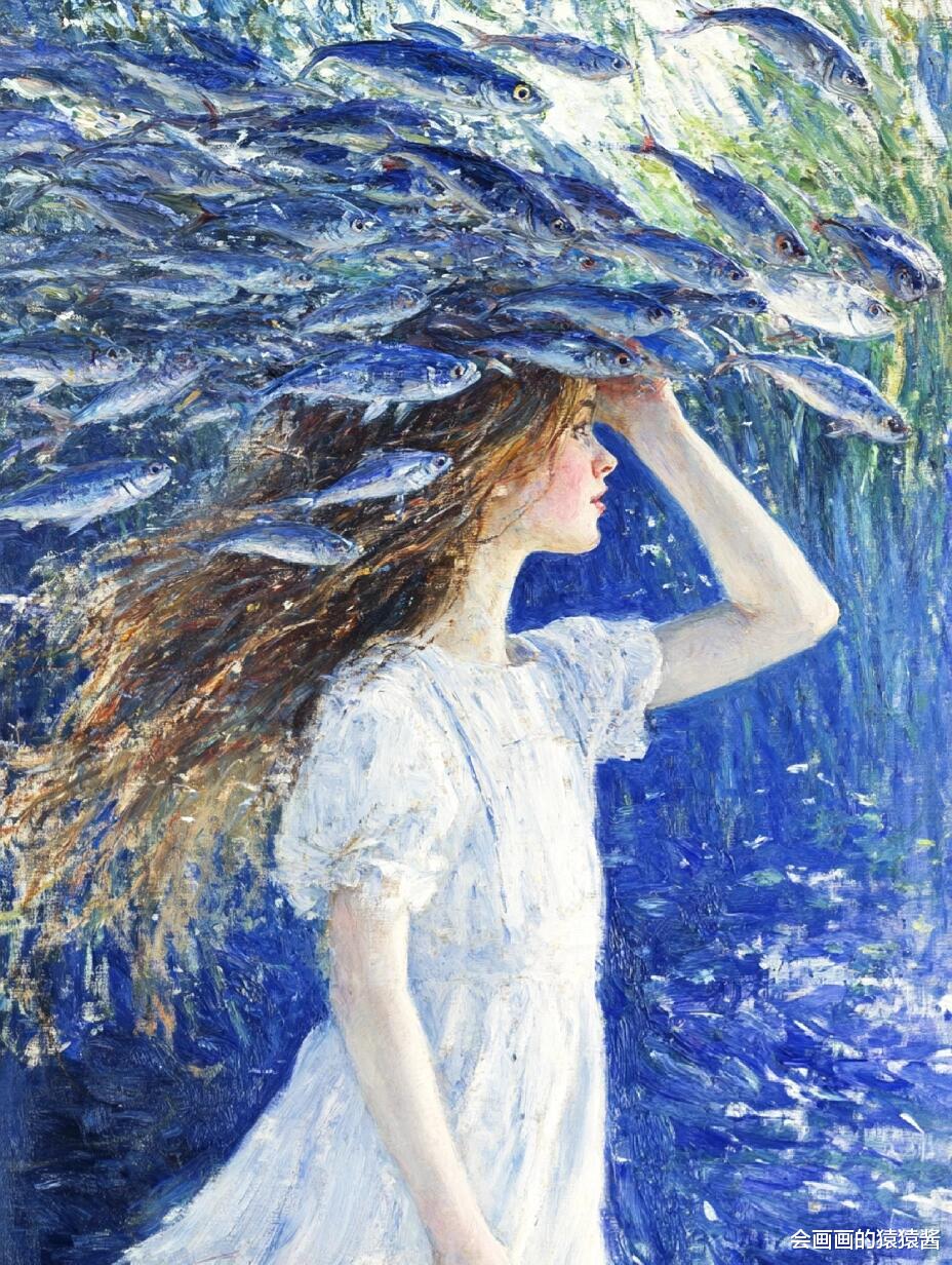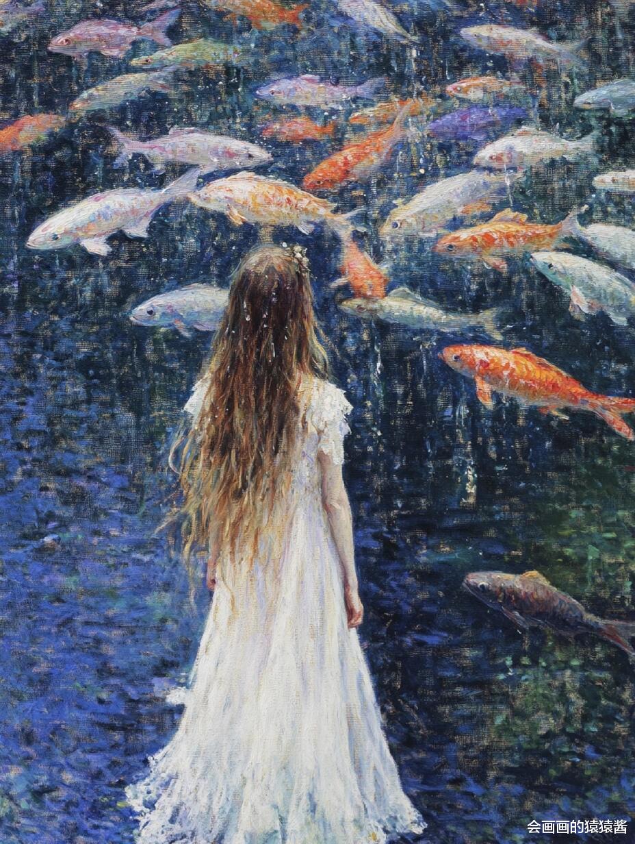 核心是精准还原水下光影与油画质感:先通过「厚涂笔刷强化」节点,用堆叠笔触模拟传统油画的颗粒肌理,让发丝的蓬松感、水面的波光更有层次;再用「水下光影模拟」节点,还原阳光穿透水面的丁达尔效应,让人物皮肤、发丝呈现自然的水波纹光影折射;接着用「色彩分层控制」节点,锁定清透蓝调主色,搭配鱼群的缤纷色彩,保证画面通透不沉闷;最后用「构图锚点引导」节点,将少女置于视觉中心,让鱼群与水面形成自然延伸,强化画面纵深感。