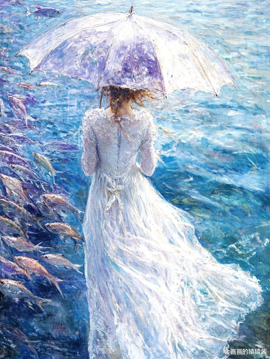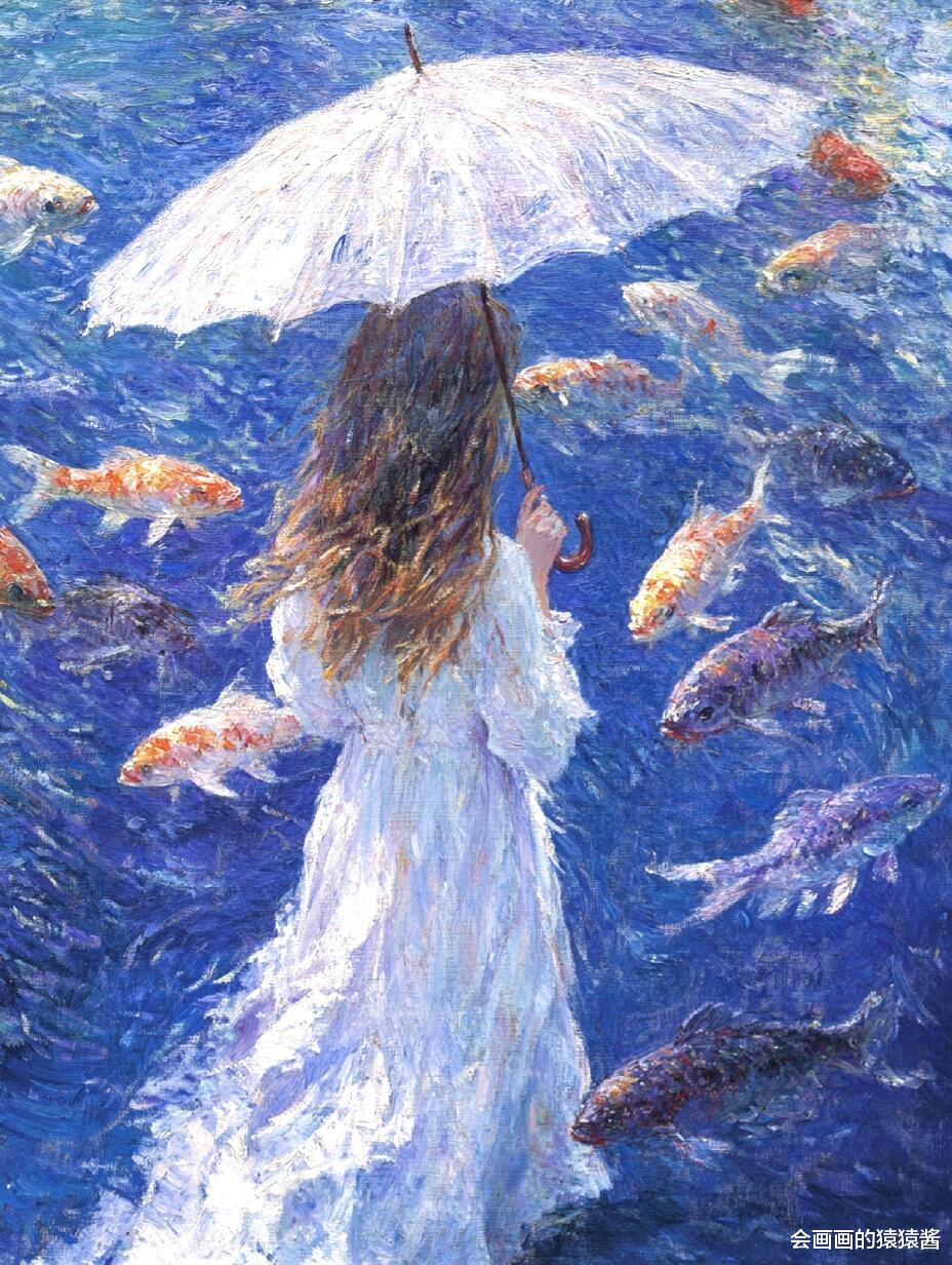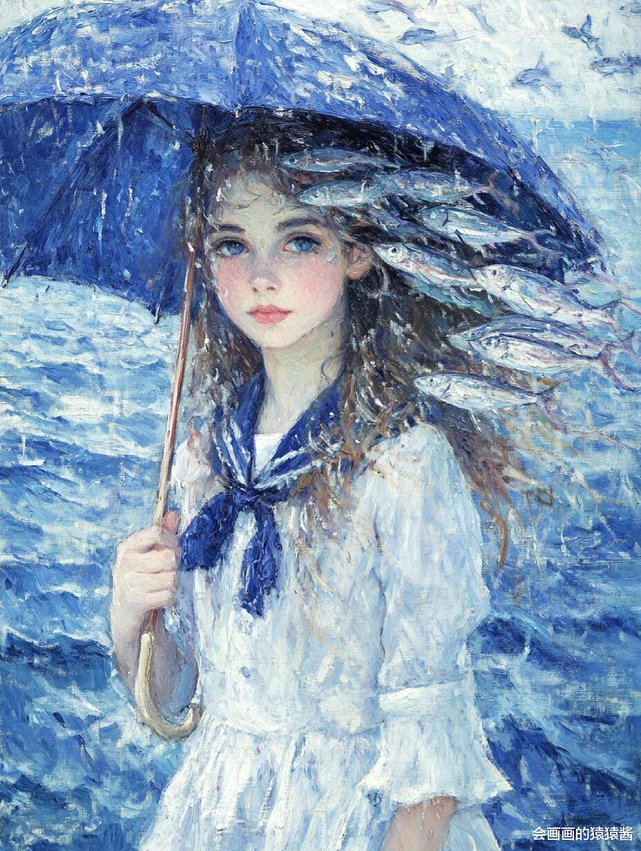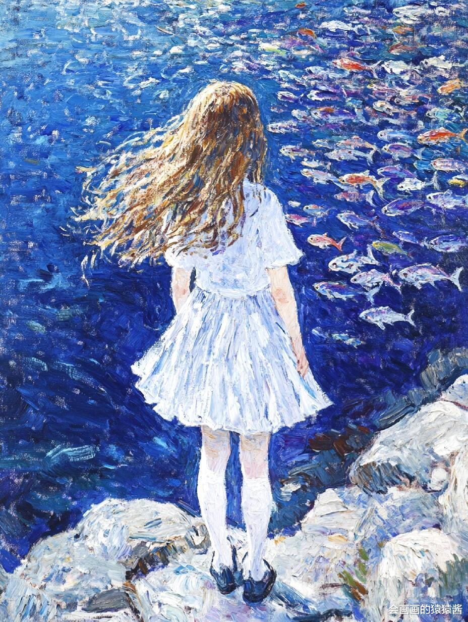 核心是精准还原水下光影与油画质感:先通过「厚涂笔刷强化」节点,用堆叠笔触模拟传统油画的颗粒肌理,让发丝的蓬松感、水面的波光更有层次;再用「水下光影模拟」节点,还原阳光穿透水面的丁达尔效应,让人物皮肤、发丝呈现自然的水波纹光影折射;接着用「色彩分层控制」节点,锁定清透蓝调主色,搭配鱼群的缤纷色彩,保证画面通透不沉闷;最后用「构图锚点引导」节点,将少女置于视觉中心,让鱼群与水面形成自然延伸,强化画面纵深感。