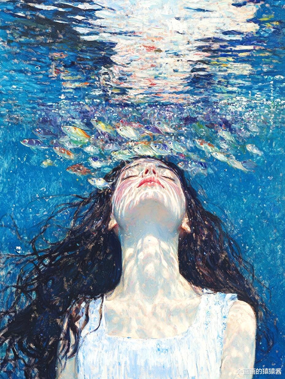 配套 ComfyUI 核心提示词竖版构图,水下少女厚涂油画,仰浮于清澈海水中,阳光穿透水面的丁达尔效应,水波纹光影折射,黑色长发随水流舒展,五彩鱼群环绕,清透蓝调主色,厚重油画肌理,印象派笔触,治愈氛围感,高清 8K。