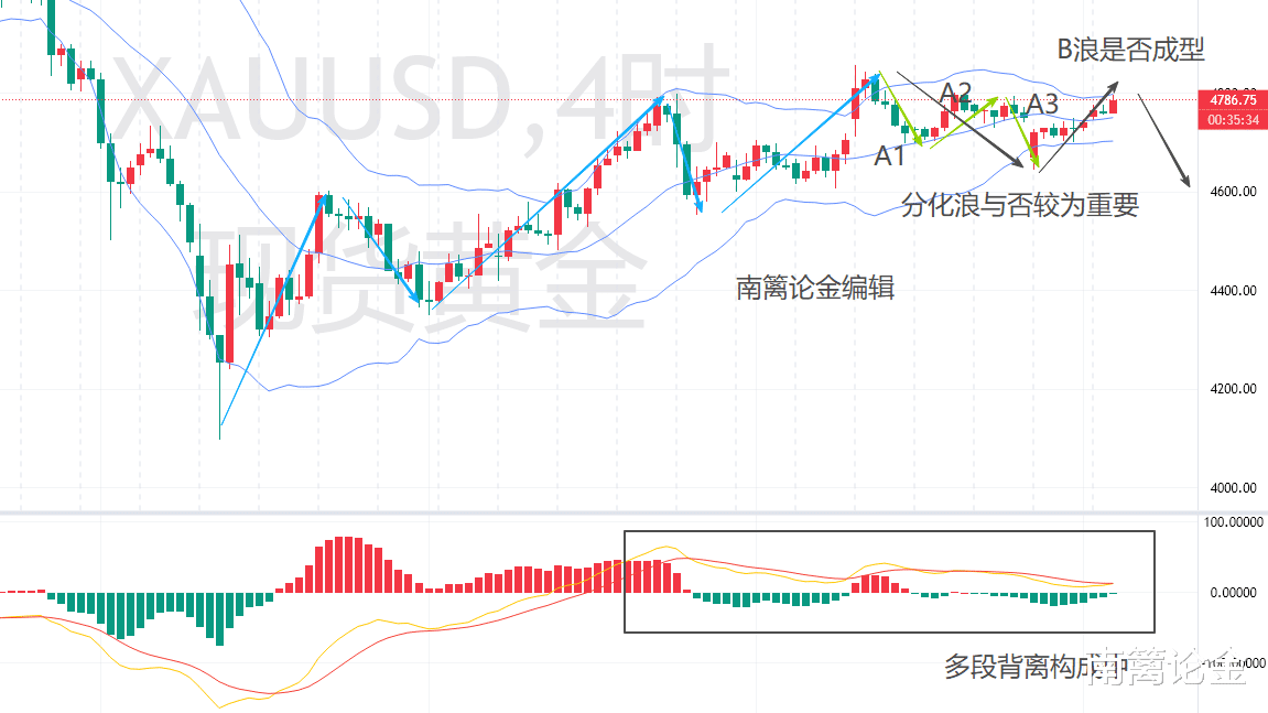 另外,技术面上还有一个关键点:虽然4小时级别中,5浪转三浪的小三浪部分已经走完,但如果前期高点4850未能有效破位,我们可以将前一阵的三浪,看作是真正ABC三浪中A浪的分化浪。也就是说,分化浪结束后,当前从4640拉升起来的走势,才是真正的B浪。如果金价无法突破前高4850的阻力,C浪将会启动,届时行情可能会迎来进一步下跌,给到更好的布局机会。