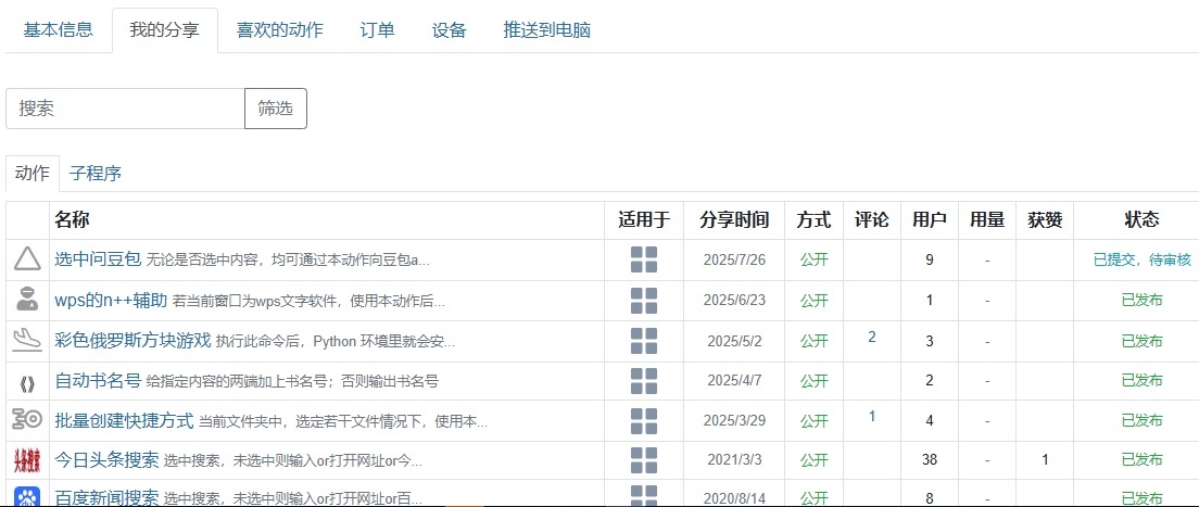 我在日常的教学、办公等事务中,一方面有使用Quicker动作库中现成的一些动作,另一方面也有开发一些动作供自己使用。我所开发的动作当中,其中一部分被我分享到了Quicker的动作库,图中便是我所开发的动作当中已经分享出去的部分,最顶上的“选中问豆包"那个动作在今年7月26日公开发布后,近期又有做了一些更新和改版,如果后续审核通过的话,那么到时候大家在Quicker的动作库当中便会看到更新后的版本。