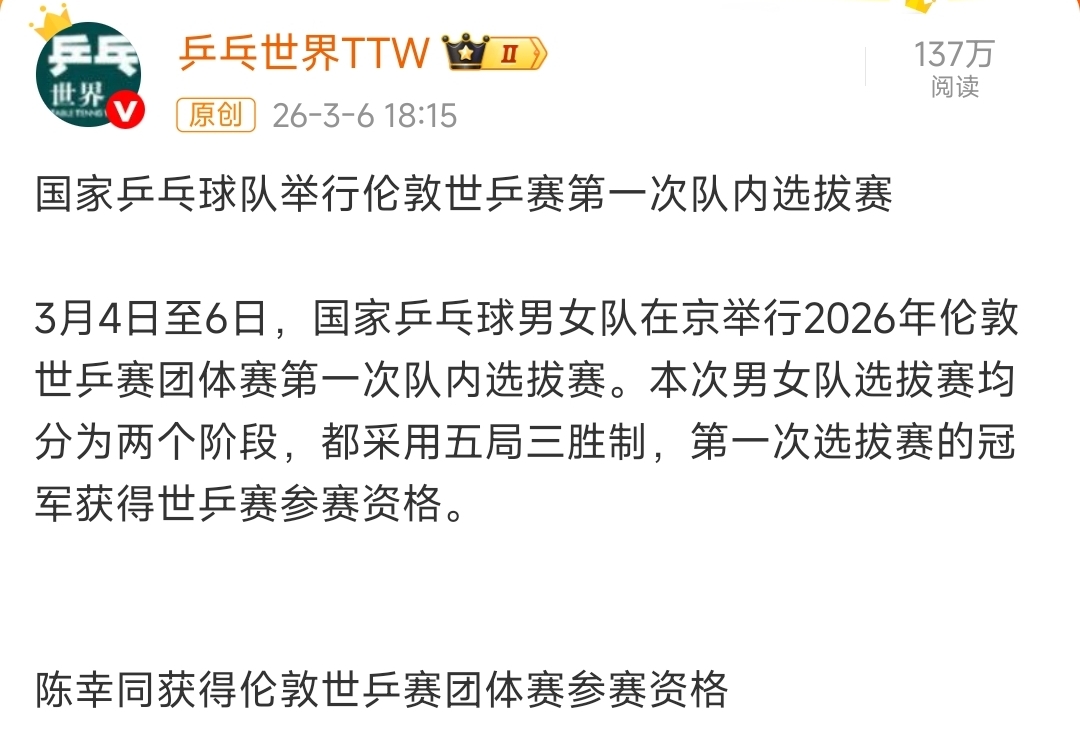 要知道黄友政目前确定没有获得澳门世界杯参赛资格,想要争取伦敦团体世乒赛参赛资格,并且在伦敦团体世乒赛之前获得比赛表现机会,如今只剩WTT重庆冠军赛的参赛机会。