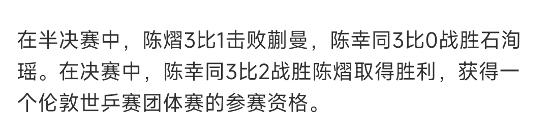 蒯曼此次WTT重庆冠军赛可谓压力颇大,从前几日结束的WTT新加坡大满贯比赛中,女单不敌日本选手早田希娜,女双搭配陈熠不敌日本组合早田希娜/张本美和,到国乒出发重庆前夕举办的针对伦敦团体世乒赛的第一次队内选拔赛中因不敌队友陈熠,丢失队内选拔资格。此次选拔赛第一名选手陈幸同获得伦敦团体世乒赛参赛资格。目前蒯曼还没有伦敦团体世乒赛参赛资格,除了需要依靠接下来的WTT重庆冠军赛和澳门世界杯两场比赛的赛场表现,还可能需要继续打队内选拔赛,最终由国乒教练组结合国乒各位队员表现确定给予资格队员。