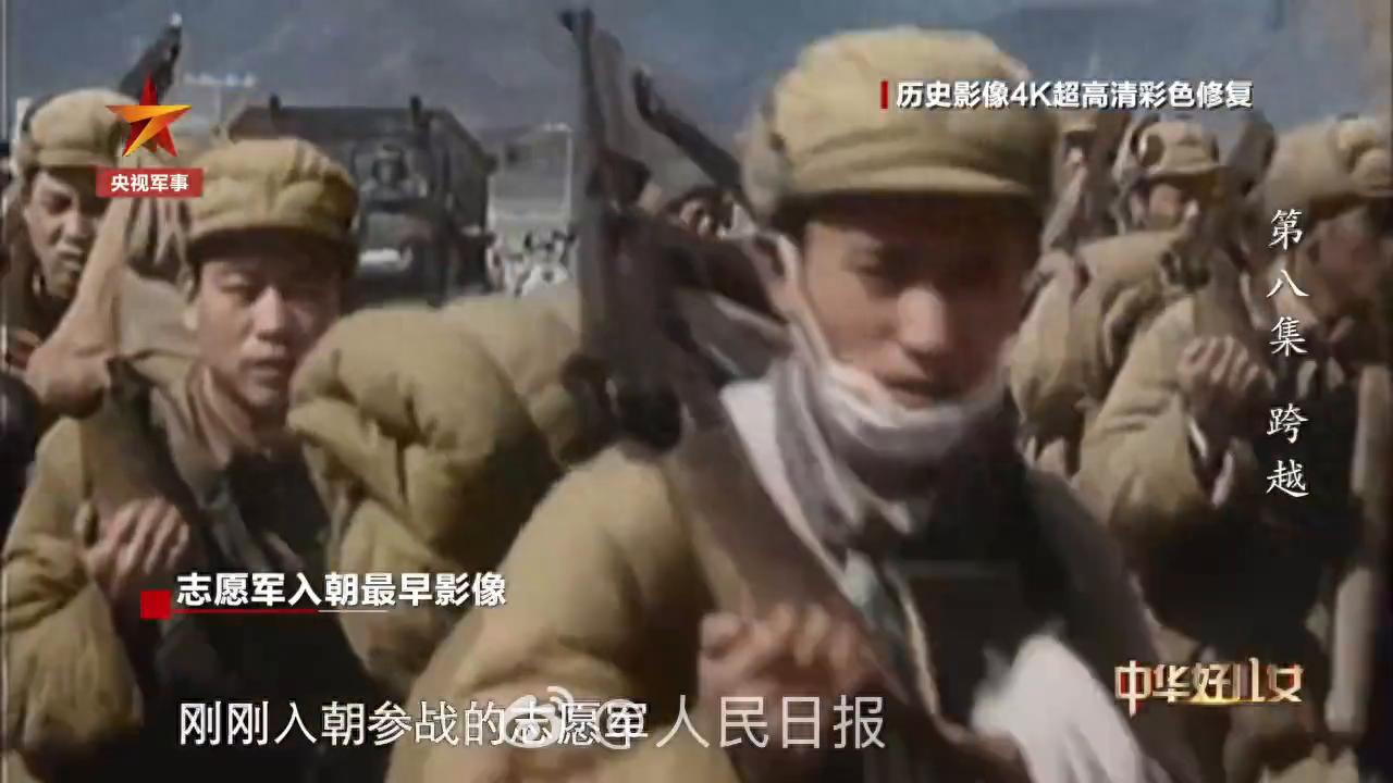 这是目前最早的中国人民志愿军跨过鸭绿江的影像。从中可以看到刚刚入朝参战的志愿军全部只有轻型武器,物资弹药还要靠扁担和骡马运送。