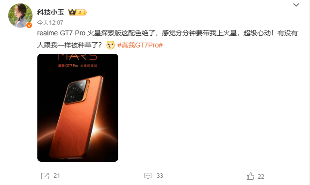 其中真我GT7 Pro新机也定档在11月4日发布,而临近发布会,有关新机的消息也是越曝越多。而就在今日,真我realme副总裁徐起也是首次公布真我GT7 Pro的真机海报。据了解本次主打色名叫火星探索版,该配色主要是通过全新的多层热锻AG工艺,使得后盖材料在热锻过程中形成复杂的弯曲形状,从而呈现出赤红蔓延的火星地表纹理。不少网友在看到这一配色都给予了极高的评价,不仅直言“辨识度拉满”,“绝了”。就连博主也是表示“超级心动”。