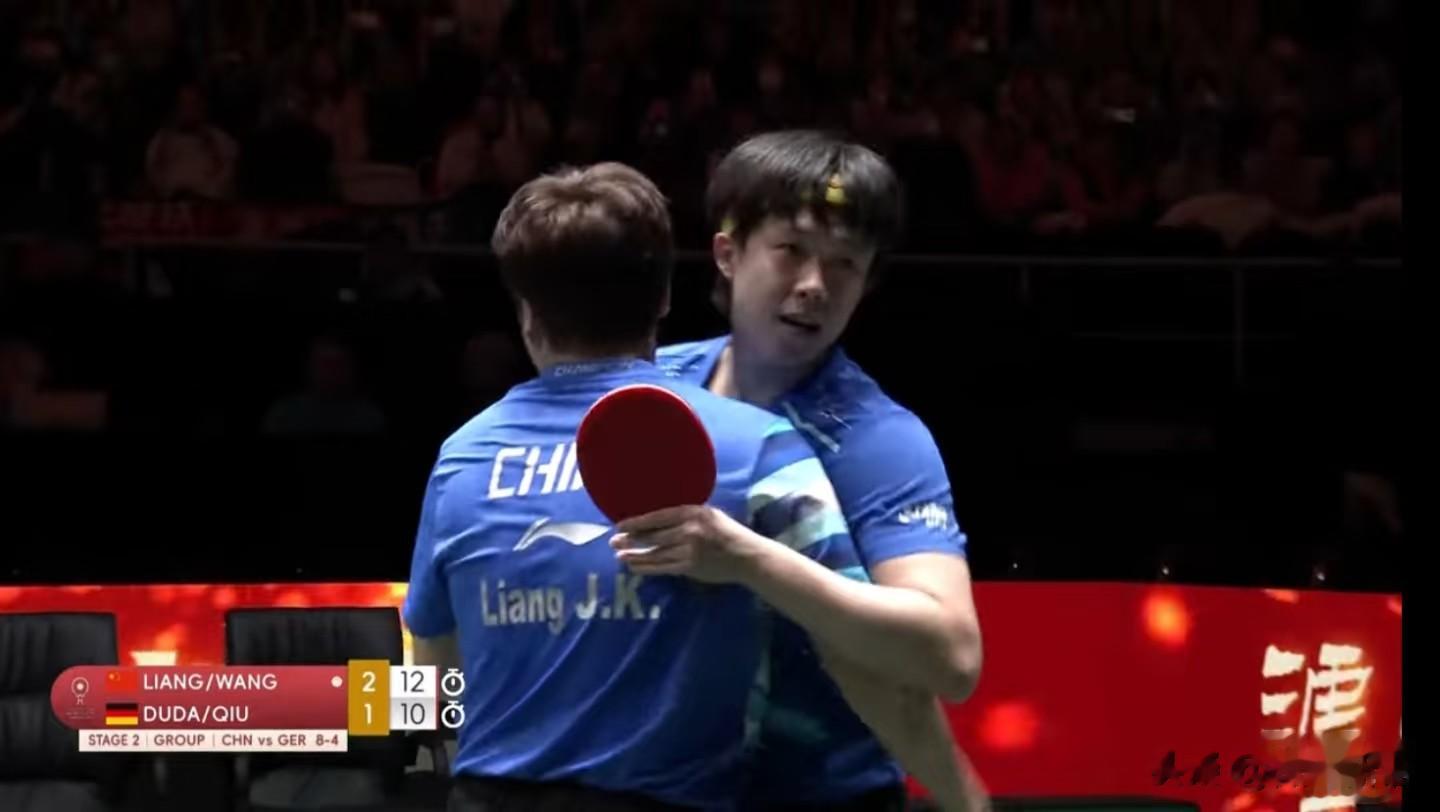 前面三盘比赛结束后,中国队大比分是6-3领先,所以男双只要能赢两局就能拿下今天的比赛。上来第一局王楚钦/梁靖崑也需要适应一下对手,丢了第一局,但是俩人调整的很快,第二局是11-3赢下,接着第三局是12-10赢了,最后两分球打的特别精彩,赢下比赛后看到梁靖崑和王楚钦都笑了,真的不容易。最终中国队是8-4战胜了德国队。