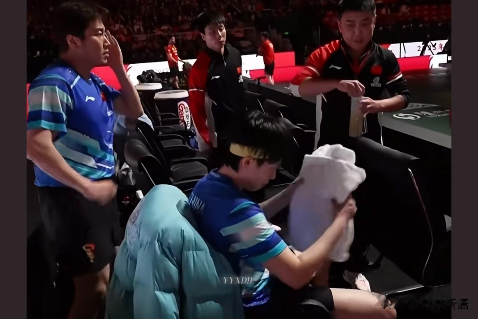 男单比赛结束后,王皓让楚钦坐下来休息,在那跟楚钦复盘的时候说今天一开始打的有点闷,如果是五局三胜制楚钦就能拿下的,他也是在鼓励楚钦。但是教练组今天的这个排兵布阵确实有点欠妥,排名靠后的团队决定是先打男双还是女双,德国队肯定是要拼男双。王楚钦打完男单,接着就和梁靖崑上场打男双了。