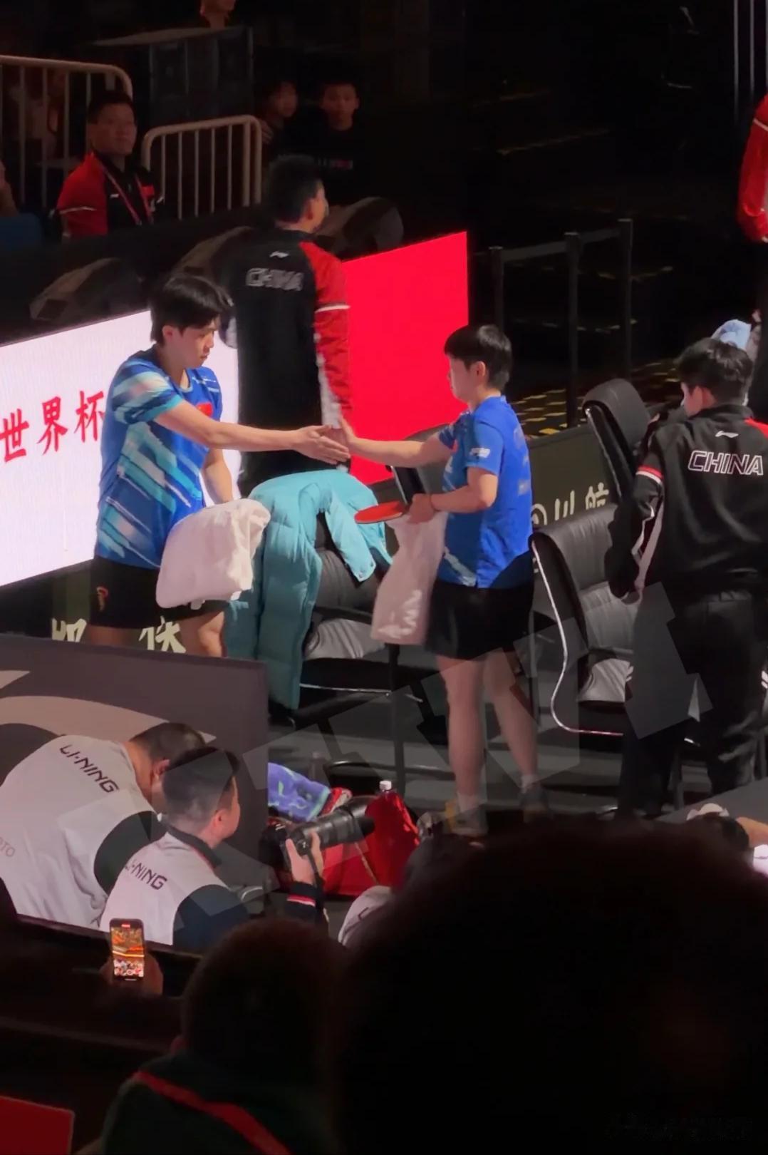 莎莎和楚钦交接班了,莎莎打完后的男单是王楚钦对阵弗朗西斯卡,莎莎在那里和楚钦击掌了。不过今天弗朗西斯卡确实打的好啊,王楚钦1-2弗朗西斯卡,第三局扳回一局。不过昨天王楚钦打了三场比赛,今天又是打完单打,继续打双打,体力消耗也大。