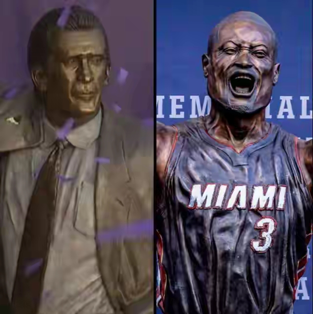 正所谓没有对比就没有伤害,相较于湖人为莱利打造雕像的精致和真实,韦德的雕像真的像是拿错了建模参考。