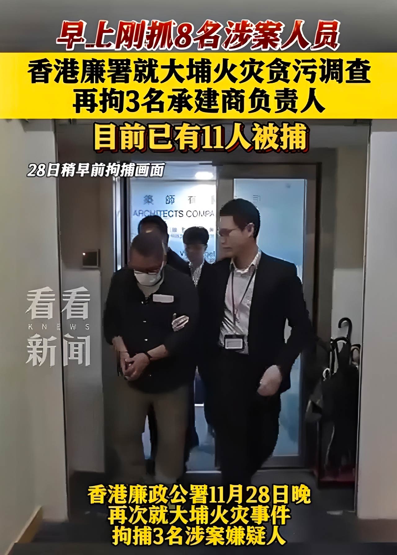 截至11月29日,廉政公署已先后采取两轮拘捕行动。继28日拘捕8名涉案人士后,29日晚再拘捕3名男子。目前,共有11人因该案被捕。新增的3名被捕者均为大维修工程承建商的负责人,年龄介乎52至68岁,此前曾被警方拘捕,获释后随即因廉署的贪污调查再次被拘。