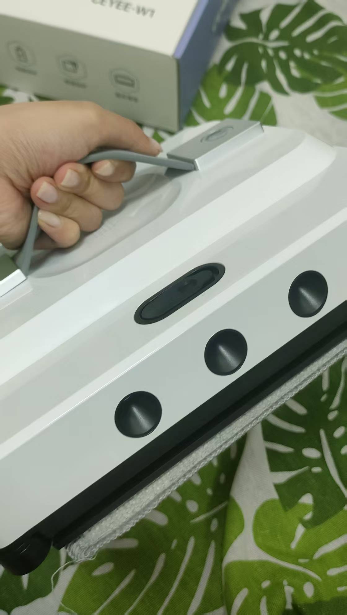溥畔绿娃擦窗机器人采用经典白色设计,在清洁使用方面,它的吸力在2000pa以下,相较于市场上一些吸力更强的擦窗机器人,在高层使用时安全性可能稍显不足。采用了超声波纳米喷水,这一设计能够让机器喷水更加有效精准的清洁窗户!机身采用插电式设计,并自带基站,内置了500mAh电池,,能够支持30min的续航,这个时间足够清理大部分家庭的窗户面积,无需频繁充电!内置30ml双水箱,采用锁水无痕技术的高密度纤维抹布,擦拭更干净,AI路径规划,配置多种传感器,一键生成全自动擦窗路径,三种清洁模式,远程蓝牙遥控,但不支持手机APP远程控制,无法预约清洁或远程查看状态,使用灵活性有限,相比一些支持APP控制的擦窗机器人,在便捷性上有所不足。