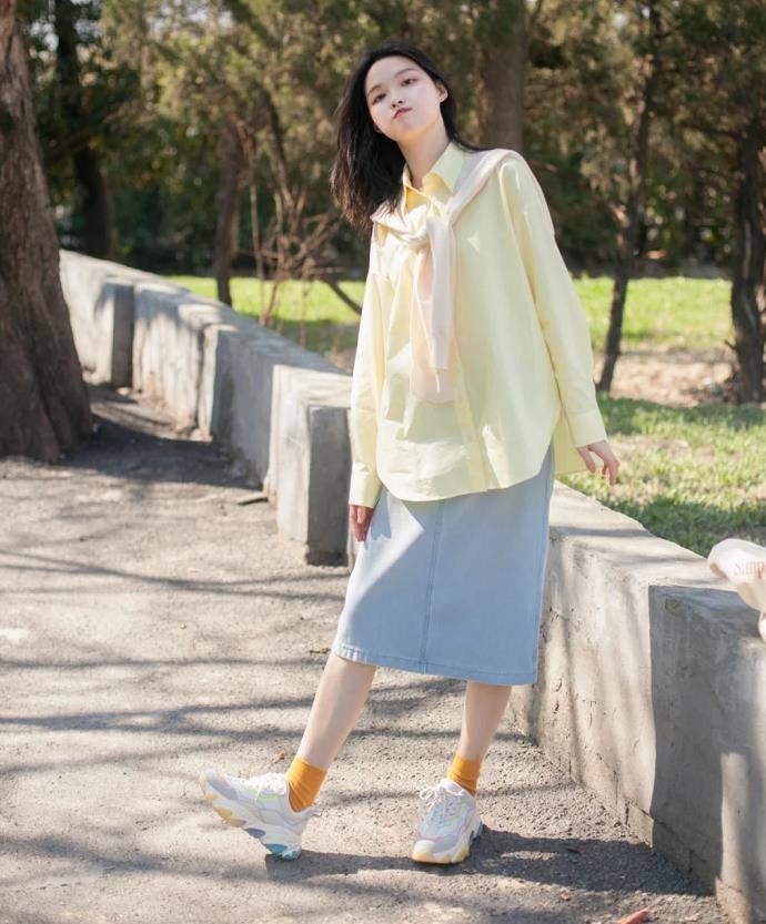 而且,在搭配上,运动鞋也可以很好与各种衣服相配,浅黄色衬衫+浅蓝牛仔裙,这一身浅色调的穿搭,瞧着就特别清新,很衬肤色和显白,对不对?