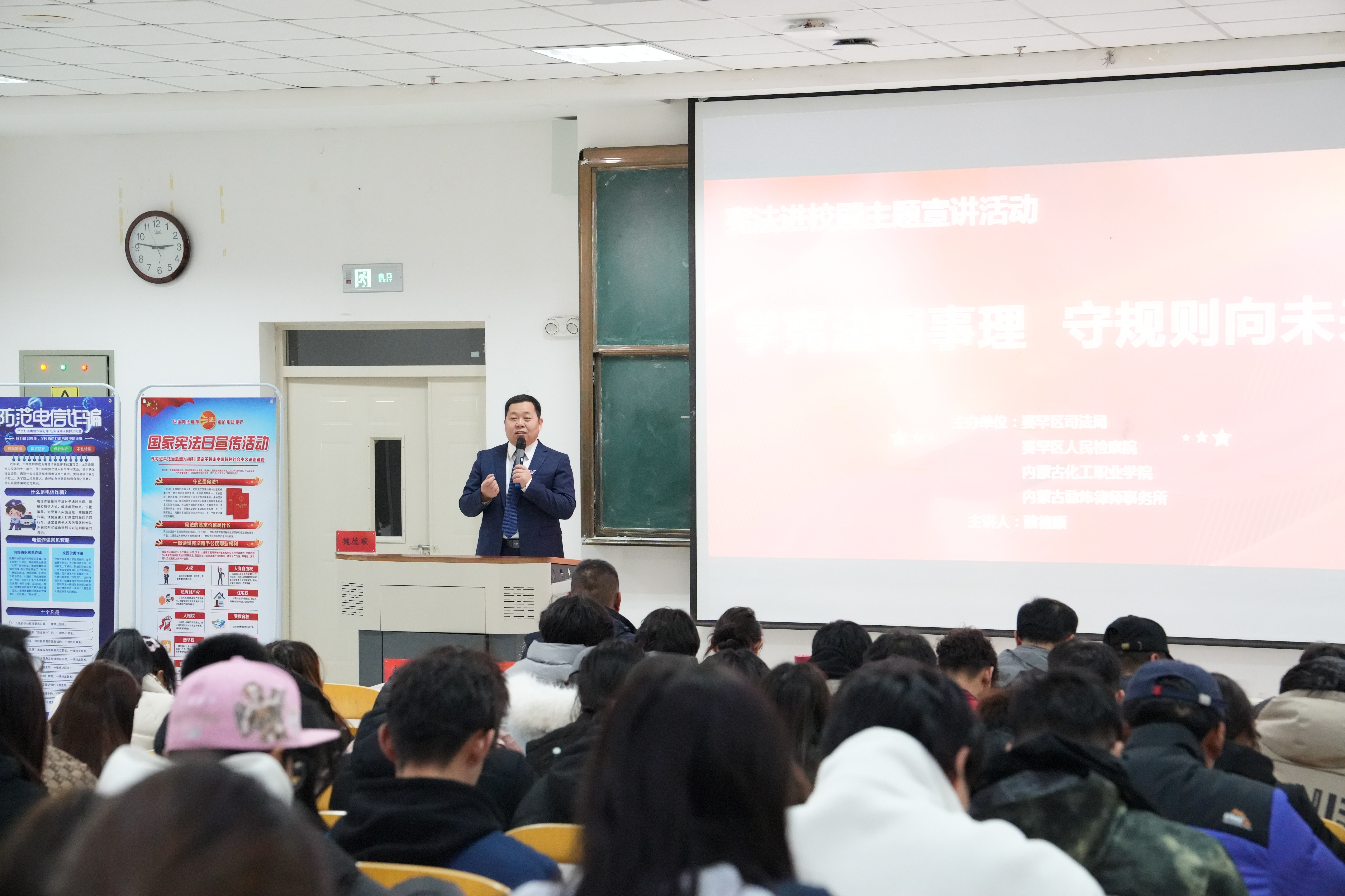 赛罕区司法局、赛罕区人民检察院、内蒙古化工职业技术学院与励炜所联合主办“宪法进校园”主题活动。励炜所创始合伙人魏德顺主任以“学宪法明事理 守规则向未来”为主题,为100余名师生带来内容翔实、实用性强的专题宣讲。魏德顺主任结合深厚专业积淀,阐释宪法作为根本大法的最高效力与核心地位,围绕“宪法与人生的9个关键阶段”梳理全生命周期权利保障要点,还介绍国家宪法日由来及宪法宣誓规范,让师生深刻体会宪法的权威与实践价值。