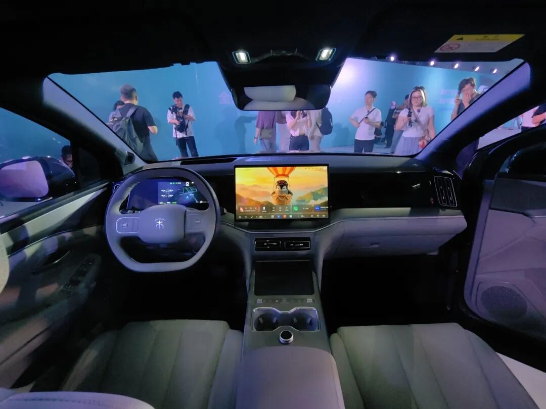 内饰方面,采用简约的设计风格,双幅式方向盘,使用怀挡设计,智能化方面,搭载15.6英寸自适应旋转中控屏+10.25英寸液晶仪表+26英寸W-HUD,配备全新UI7.0车机系统。配备手机无线快充、智能3D景深氛围灯、备智能冷暖箱等配置。