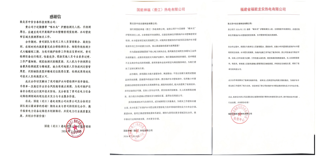 吉泰智能炉膛无人机获得国能、福能两大著名能源集团三大电厂认可,专门为吉泰智能出具了感谢信。