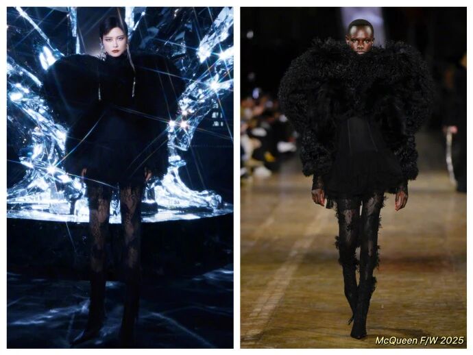 先聊最炸眼的高定造型,今晚这身 McQueen 秋冬款一出场,我直接倒吸一口气:这哪里是穿衣服,这是把 “21 年的舞台底气” 焊在身上了啊!夸张凌厉的廓形肩线,是能压得住零点场子的硬气,不是那种软塌塌的 “舞台私服”,但面料偏是哑光的软黑料,裹在身上不卡肩不压身,抬手挥麦时衣摆跟着轻晃,把 “哥特的冷” 和 “舞台的暖” 揉得刚好;黑色羽翼是短绒质感,蹭在袖口像刚晒过的羊绒围巾,直接卸去了哥特风的尖锐感 —— 我当时盯着镜头看,连羽翼的绒毛细节都看得清,这哪里是 “道具装饰”,这是把 “温柔的棱角” 穿在了身上啊!更绝的是那辆巨型水晶皇冠战车,近五千张反光碎片是手工一片一片拼的,我看到幕后图的时候都惊了:工作人员贴了整整三天,每片的角度都要调,就为了舞台光打下来时,碎光刚好裹着她的身影 —— 这哪里是 “舞台装置”,这是把 “21 年的跨年夜记忆” 拼成了星河啊!而且你们发现没?她穿 McQueen 从不是 “硬撑高定”,是高定在适配她的气质。这套秋冬款的哥特凌厉,换别人穿可能是 “刻意扮酷”,但她一穿就是 “长在身上的气场”,连 McQueen 的设计师都直言:“她的‘不被定义’,就是我们想表达的哥特内核。”