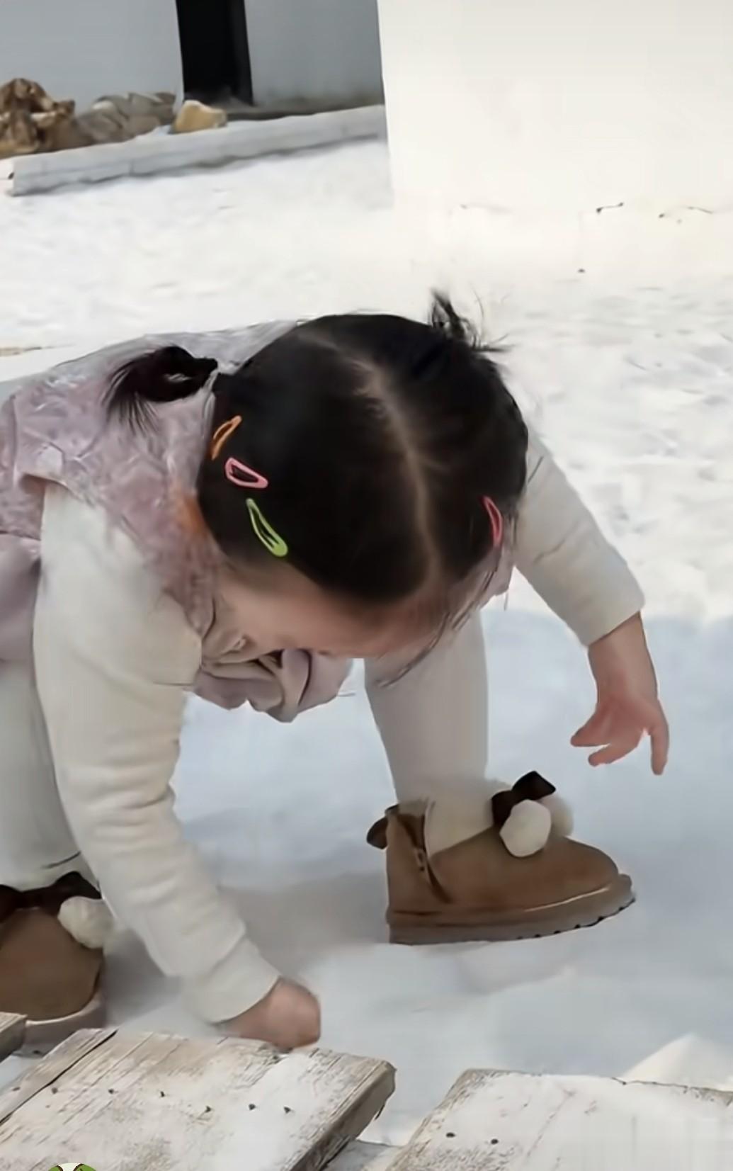 玩到尽兴时,闪闪干脆站起来蹦蹦跳跳,雪花被她的小靴子踢得飞起来,落在她的双马尾发梢上,搭配头上的彩色小发夹,像缀了小银花。她还仰着脑袋往天上看飘来的雪花,小嘴巴微微张着,伸手去接空中的雪花,雪花落在手心里瞬间融化,她就歪着脑袋看向黄一鸣,软乎乎地问:“妈妈,雪怎么不见了呀?”黄一鸣蹲下来和女儿平视,捏了捏她的小脸蛋,笑着帮她解答,母女俩头挨着头,画面温馨又暖心。