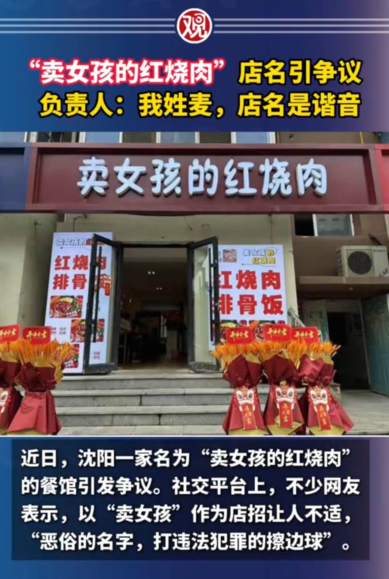 “卖女孩的红烧肉”——乍一听,你会想到什么?近日,沈阳一家以此为名的餐馆在社交媒体上引发热议。这个让人产生不良联想的店名,不少网友直指其“恶俗”,甚至质疑其在打违法犯罪的擦边球。