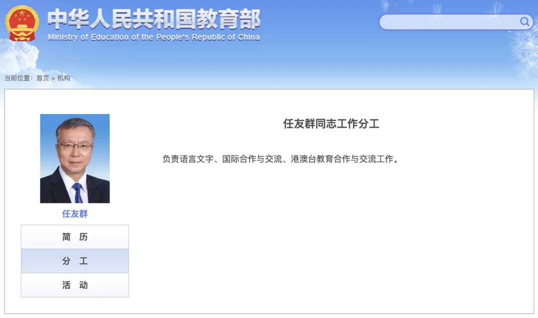 任友群:教育部党组成员、副部长。负责语言文字、国际合作与交流、港澳台教育合作与交流工作。