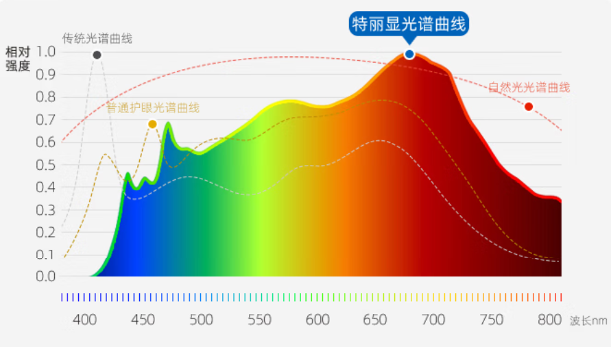 有害蓝光峰值相较RGO水准还少95%以上,光谱曲线无限拟合太阳光谱。