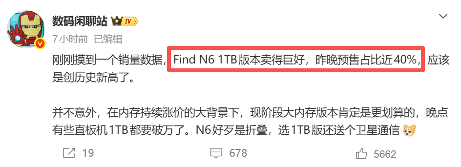 事实也印证了这一点,Find N6开启预售后,1TB版本的预售占比直接冲到近40%,创下了品牌折叠屏的历史新高。消费者心里门儿清,现在直板机的1TB版本都快卖到万元了,而Find N6作为顶配折叠屏,16+1TB卫星通信版到手11999,相较于低内存版本来说,确实更加划算。