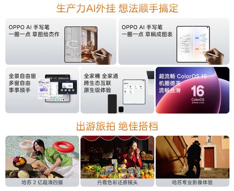 影像方面,OPPO Find N6也没有因为折痕屏需要控制部件堆叠而减配,哈苏2亿超清四摄跟直板机型比都不虚,拍人像、拍长焦都出片。超大内屏搭配全景自由窗分屏,随心切换分屏、小窗,高效又便捷,移动办公效率直接拉满。还有全新的AI手写笔,笔记、草稿一键生成整理,生产力拉满。