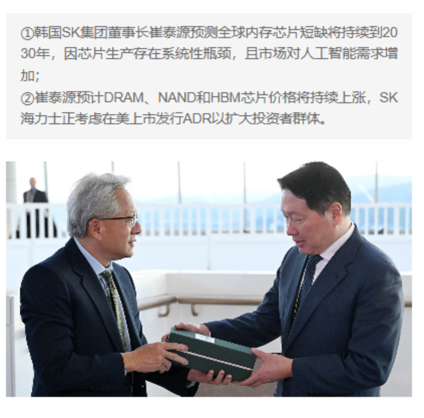 内存涨价的风越吹越大,海力士母公司SK集团董事长崔泰源在英伟达GTC大会上直言,全球存储芯片短缺将持续到2030年,DR