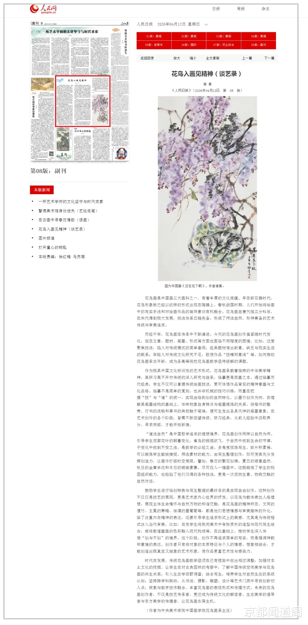 品读人民日报4月12日《花鸟入画见精神》一文,我对“精神”二字有了更为具象而深刻的体悟。原来,精神从不是悬于高空的口号,而是藏在笔墨丹青里、融在文化传承中、刻在时代发展里的力量——它无处不有,在千年花鸟画的脉络中流转;它无处不在,在每一次临摹、写生与创作中彰显;它永放光芒,在承古开新的坚守中照亮文化前行的道路。这篇文章以花鸟画为切口,剖开了中华传统文化的精神内核,让我看见艺术背后那份跨越千年、生生不息的精神力量。