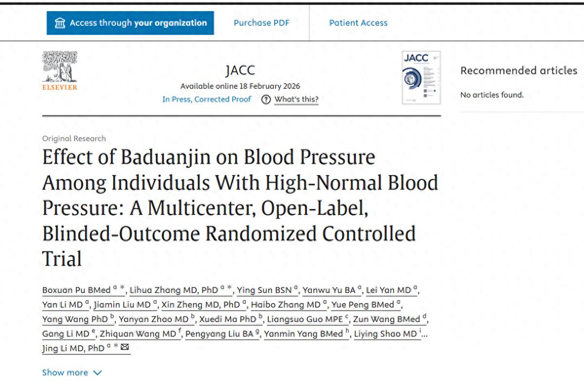 (人民日报健康客户端记者 牛雨蕾)八段锦作为一项温和的传统运动,备受中老年人偏爱,而它的健康价值也再获科学验证。2月18日,中国医学科学院阜外医院李静团队发表在《美国心脏病学会杂志》上的一项研究显示,正常高值血压人群(高于120/80毫米汞柱但低于140/90毫米汞柱)练习3个月八段锦,就能有效降低收缩压,且效果能持续1年,与快走运动相当。