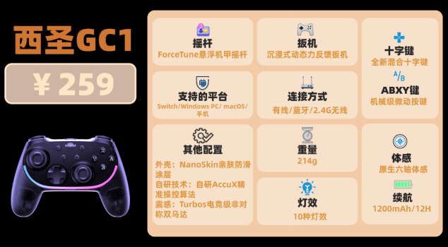 在配置表现上,西圣GC1同样强悍,搭载电竞级极速连接引擎,1000Hz回报率与智能抗干扰算法将输入延迟降至0.5ms,支持2.4G、蓝牙和Type-C三模连接,兼容Switch、PC、手机等主流设备,实现“所想即所控”。原生六轴体感传感器可捕捉旋转、倾斜和挥动等动作,1ms级低延迟与1:1映射带来沉浸式操控体验。手柄设计轻量化(214g)、握角科学(15°)、NanoSkin亲肤防滑涂层贴合手型,握持舒适稳固。半透明幻雾晶透机身结合RGB灯效和10种炫酷模式,科技感十足,同时兼具耐磨与防指纹性能,让手柄不仅手感极佳,也十分赏心悦目。