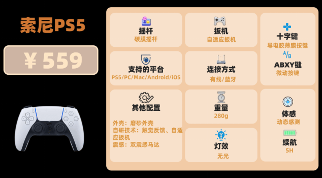 手柄外壳的磨砂触感细腻且防滑,长时间握着也不会觉得手心腻或者累。按键和摇杆布局依旧是索尼那套熟悉的体系,自适应扳机和细腻触觉反馈又是这代手柄最核心的亮点——不同游戏会给你不一样的阻尼与震感,比如赛车里的油门力度、射击时的压枪感,都能被它表现得比较逼真。唯一的小遗憾是,用久了某些自适应场景下阻尼会稍微偏硬一点,触觉反馈在极个别游戏里也会显得有点“过头”,但这种设计在手柄当中还是比较有个性化的。