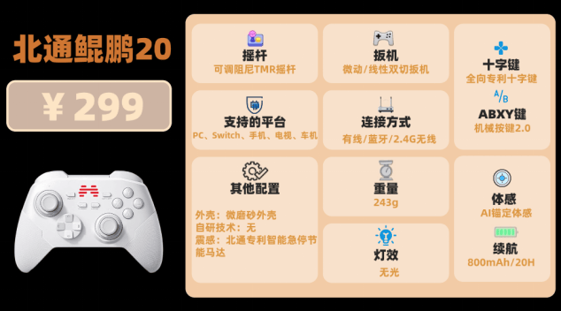 震动方面支持AI场景自适应,细节表现比同价位产品更足;十字键段落感自然,方向触发易上手。连接方式覆盖有线、蓝牙5.3与2.4G,三模切换顺畅,兼容PC、Switch、手机、电视和车机等多个平台。续航为20小时,同时支持边玩边充基本不会影响体验。