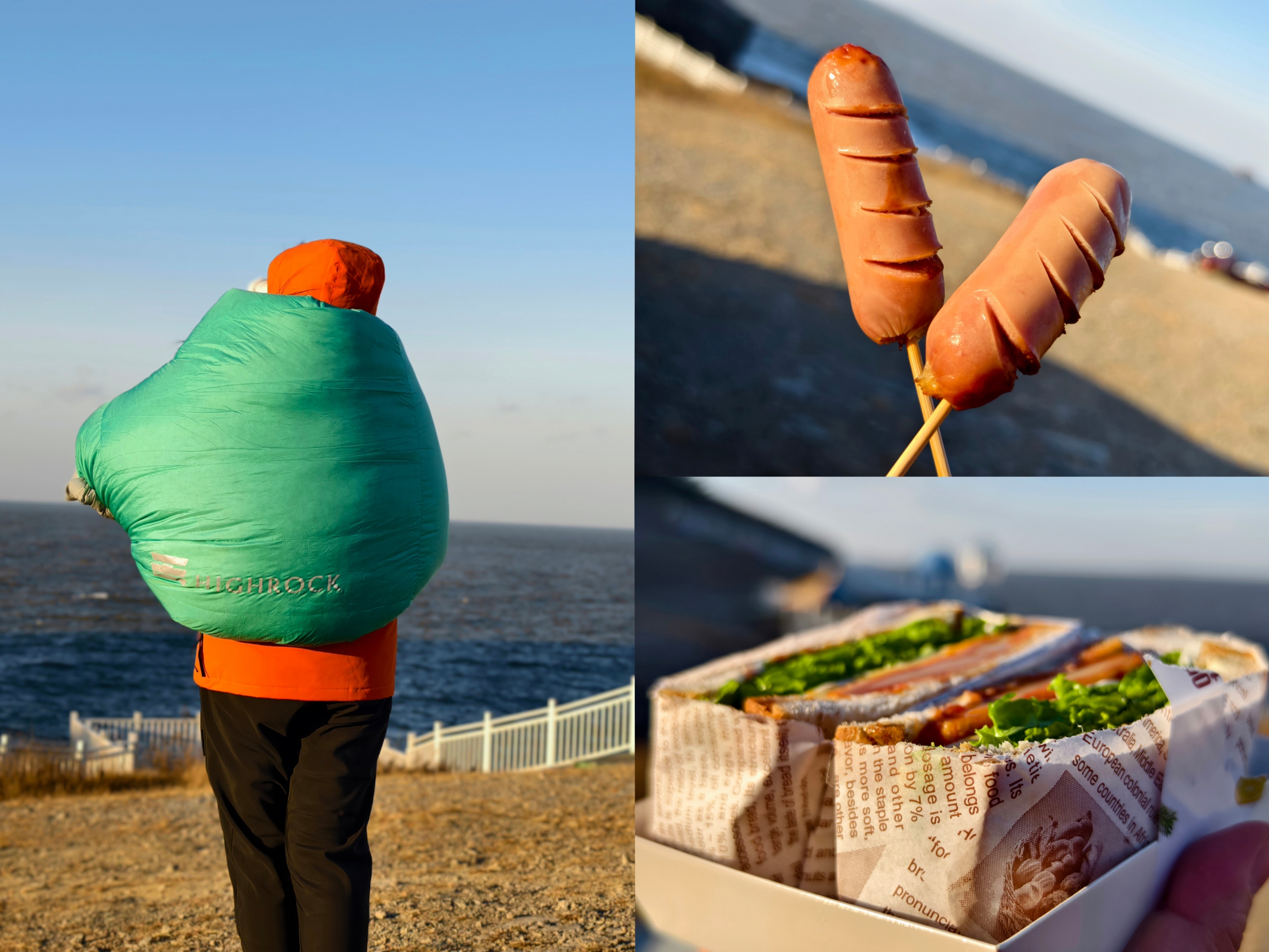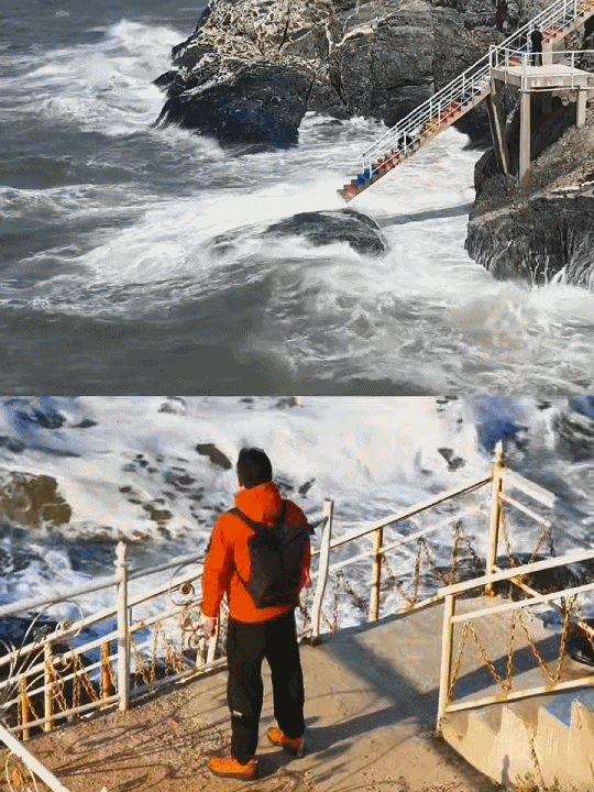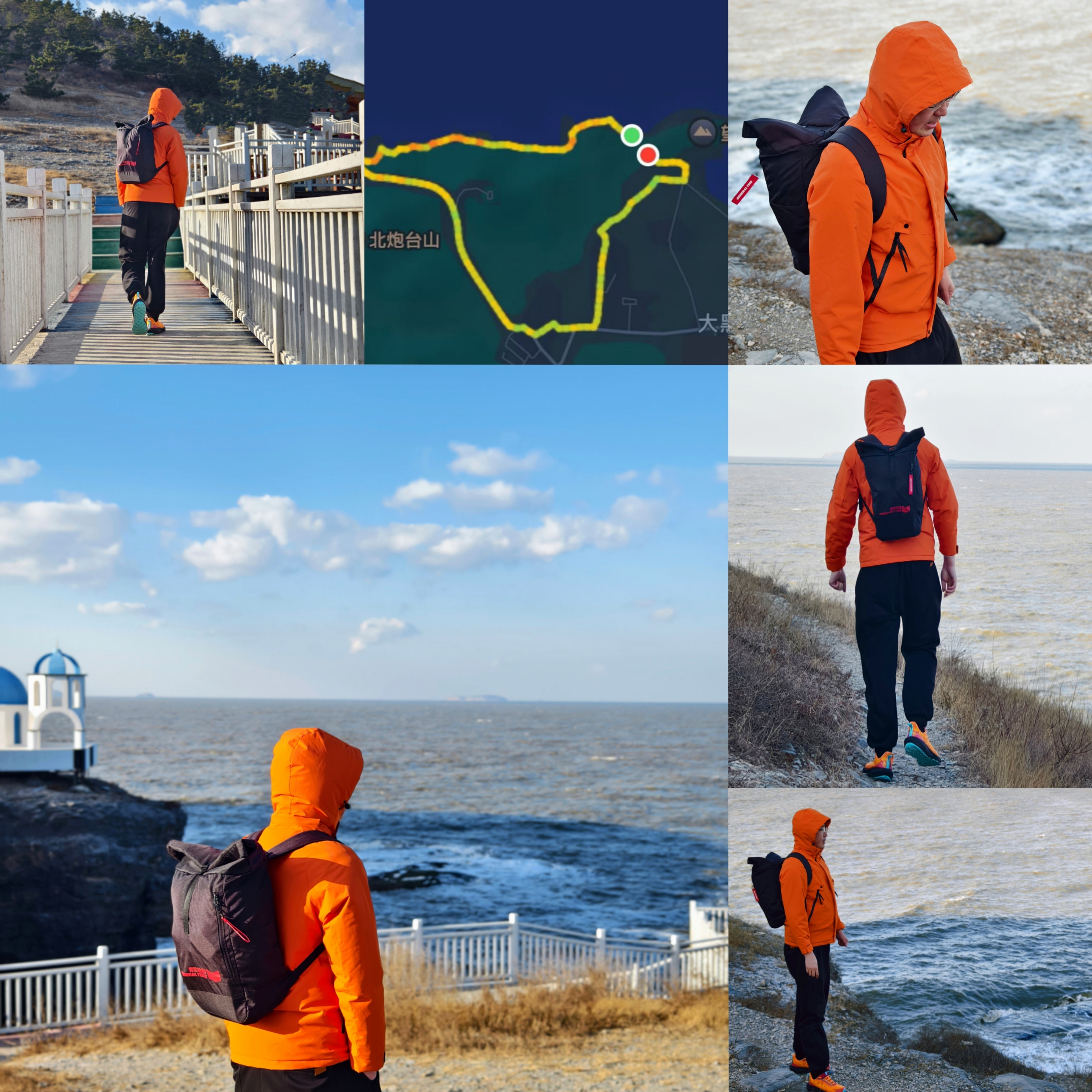 前些日子添置了新的露营装备,就一直在等降温,12月5日大连黄色大风警报,兴奋了一票等风的我们,去望渔山大环线徒步,登山,去看海风掀起的巨浪捶打的独角礁!据说拍照巨出片!刚到时海还算平静,体表温度零下14度。有些冷。我套着睡袋矗立远眺,让同行人员戏笑海边新雕塑。后来我的睡袋争抢的成为了大家的披肩。