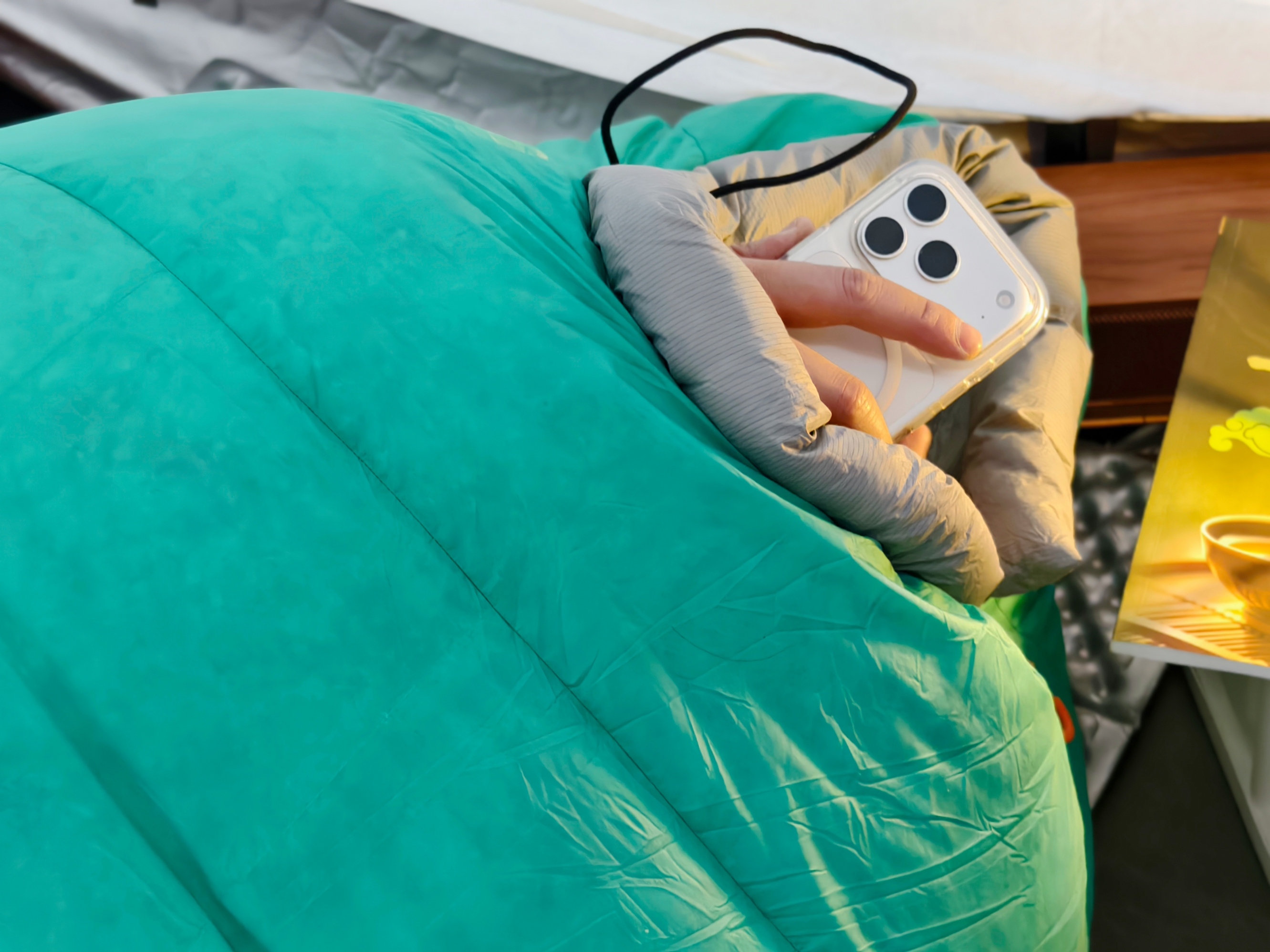 锁紧后。睡袋的空间还不影响刷手机。妙啊!