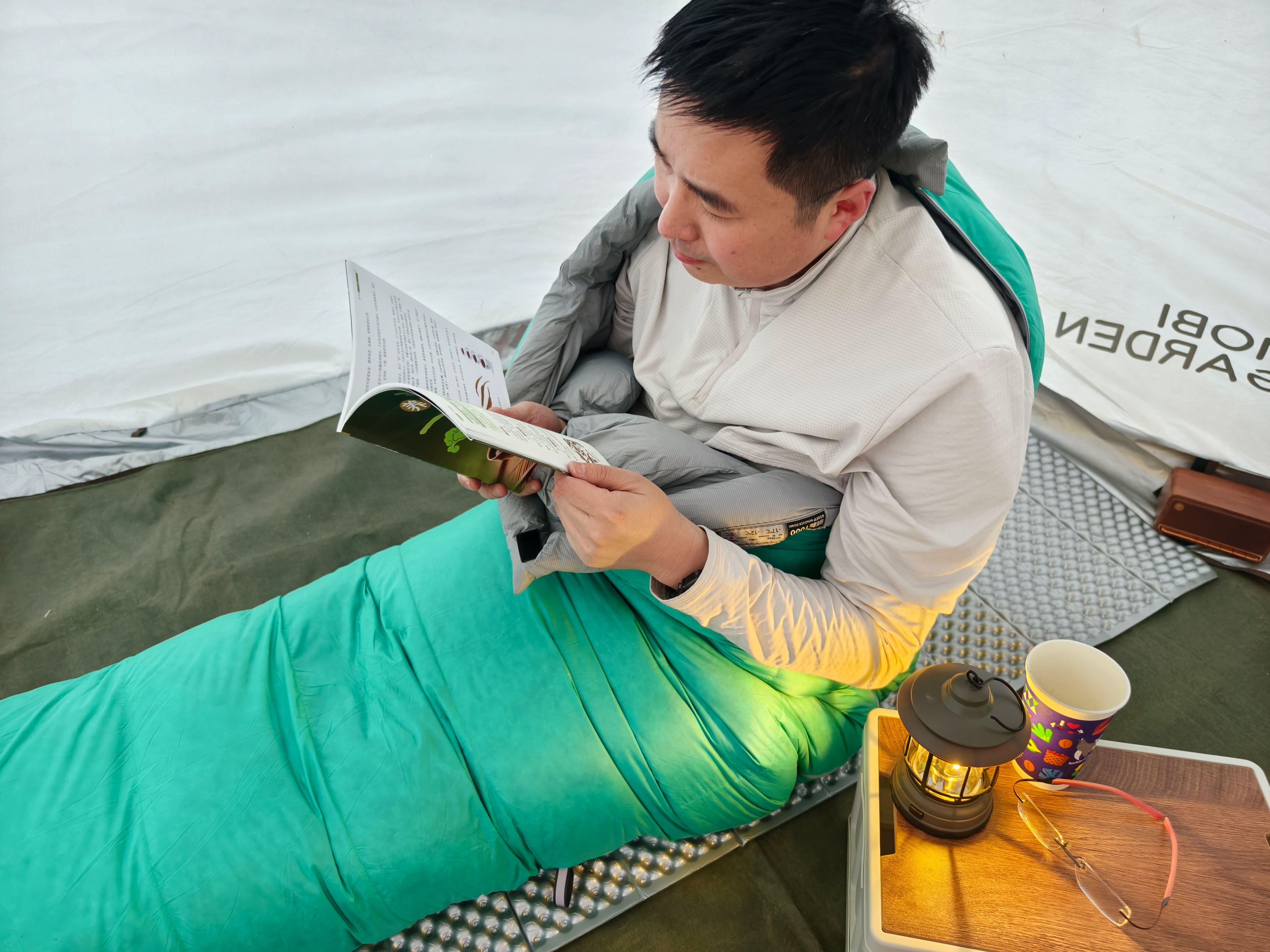 因为当天的风特别大,长时间户外以经让我们感觉有些冷了。在帐篷没有搭建好前,都钻到睡袋里回了回温。我这款天石驯鹿睡袋,可以经过RDS国际认证的。不是所有睡袋的鸭绒都有RDS国际认证的。能通地认证的鸭绒轻到飘,达到650蓬,绒朵大而密,质地细腻还要坚韧,这样才能成为RDS认证的安心羽绒。