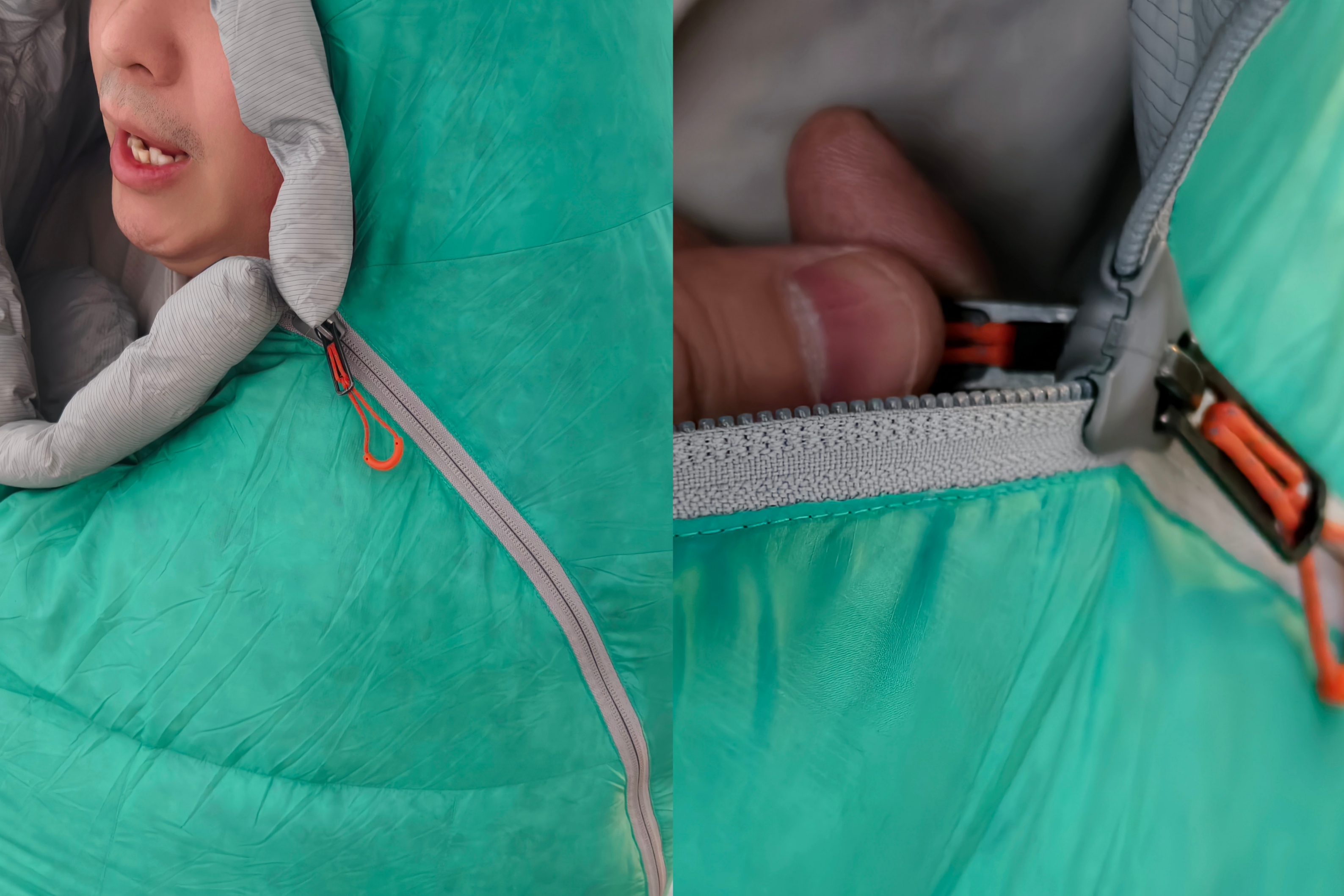 睡袋的YKK双开拉链可以自行在里面开合睡袋。非常人性化。还增加了防夹套,可以更好的保护睡袋也让拉合更加顺畅。