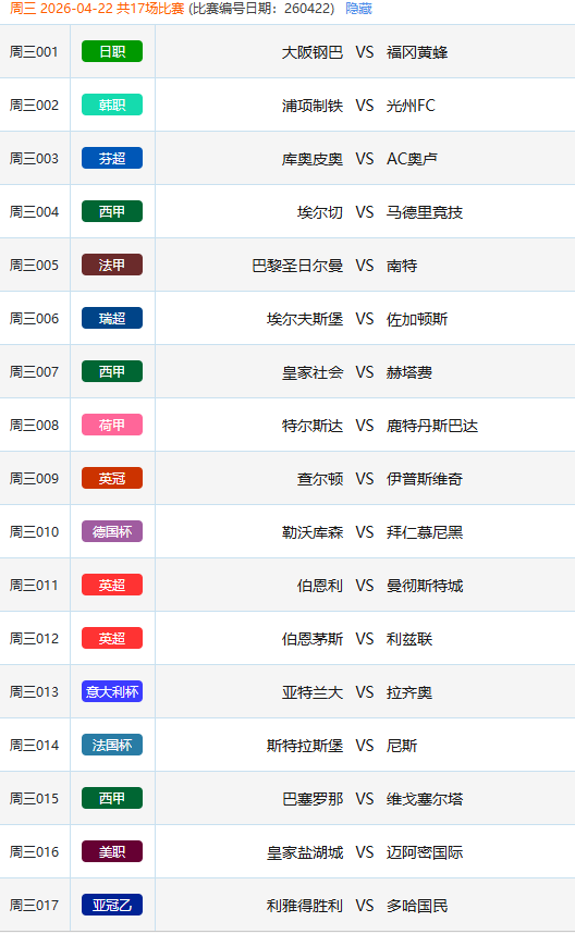 其余场次周三 001 日职:大阪钢巴 VS 福冈黄蜂✅赛事看好方向:主胜✅参考分数:2-0、2-1✅进球数参考:2-3 球✅解析:大阪钢巴主场作战优势明显,攻防两端表现均衡,主场拿分效率稳定;福冈黄蜂客场状态起伏较大,面对主队的高压逼抢难以形成有效反击,主胜为核心方向。