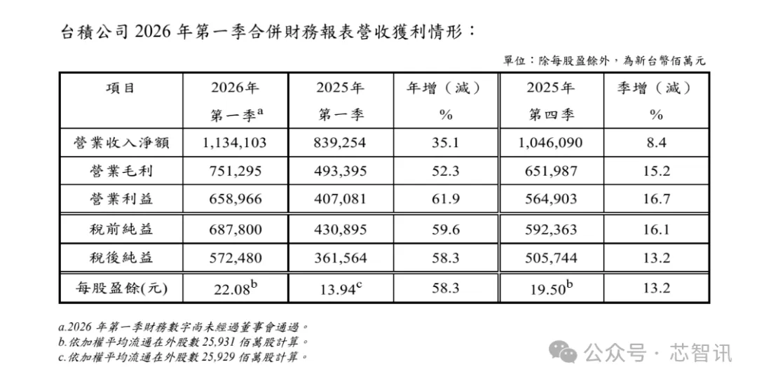 台积电一季度合并营收约新台币11,341亿元,同比增长35.1%,环比增长8.4%,创下历史新高;税后净利约新台币5,724.8亿元,同比增长58.3%,环比增长13.2%,创下历史新高;每股收益为新台币22.08元(折合美国存托凭证每单位为3.49美元),同比增长58.3%。