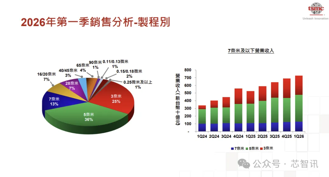 从各制程工艺收入占比来看,台积电3nm占比25%,5nm占比36%,7nm占比13%。总体而言,先进制程(包含7nm及更先进制程)的营收达到全季晶圆销售金额的74%。