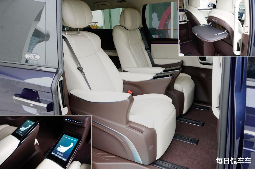 用5英寸车扶手屏来控制所有功能,老板的尊贵感给足了。还有可翻折小桌板和66W快充口,车顶有17.3英寸吸顶屏、地台有车载冷暖冰箱,办公追剧唱K聚餐,这个空间你想干啥都行。另外,这款车也十分注重座舱的空气健康品质,全车都采用低VOC环保材料,内饰气味、过敏原、致癌物等五大健康维度,实测数据远优于国标,甲醛、苯等致癌风险指数仅为限值的1/10甚至0,同时也是首款通过中汽研“中国健康汽车”权威认证的MPV。