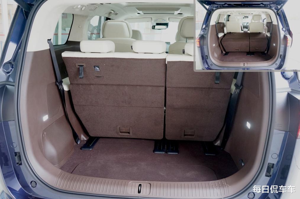 七座满员情况下,尾箱常规容积达到700L,可容纳4个24寸和4个20寸行李箱,每个人的行李箱都塞得进。后排座椅还支持4:6分割放倒和前后滑动,最大装载容积可达2500L,搬家都够用了。