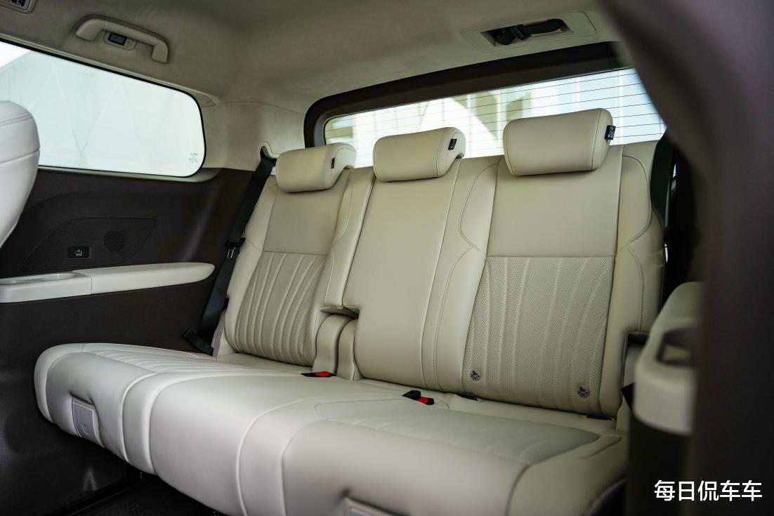 侃哥(身高172cm)坐在后排,517mm的坐垫进深(比同级均值多15%)、365mm的座椅高度(比同级均值多14%)带来充足承托,腿部与头顶均有两拳多空间,高个子乘坐都没问题,真正做到了三排平权。更好的是靠背角度可以调节,第三排同样可以“葛优躺”,坐垫还支持240mm前后滑动,可以在载人和载物之间灵活调节。