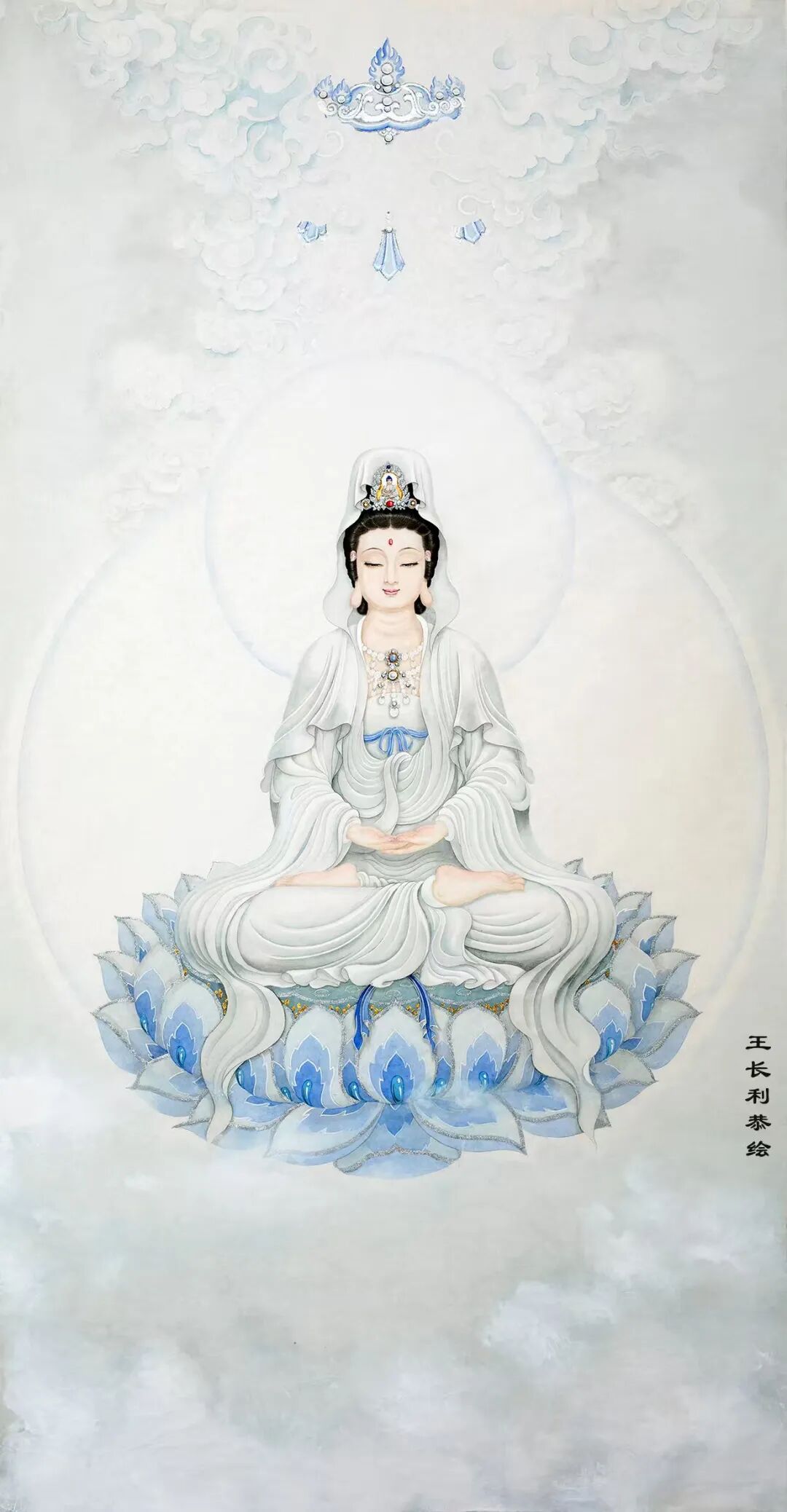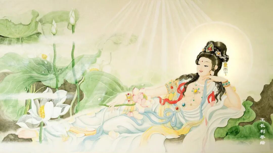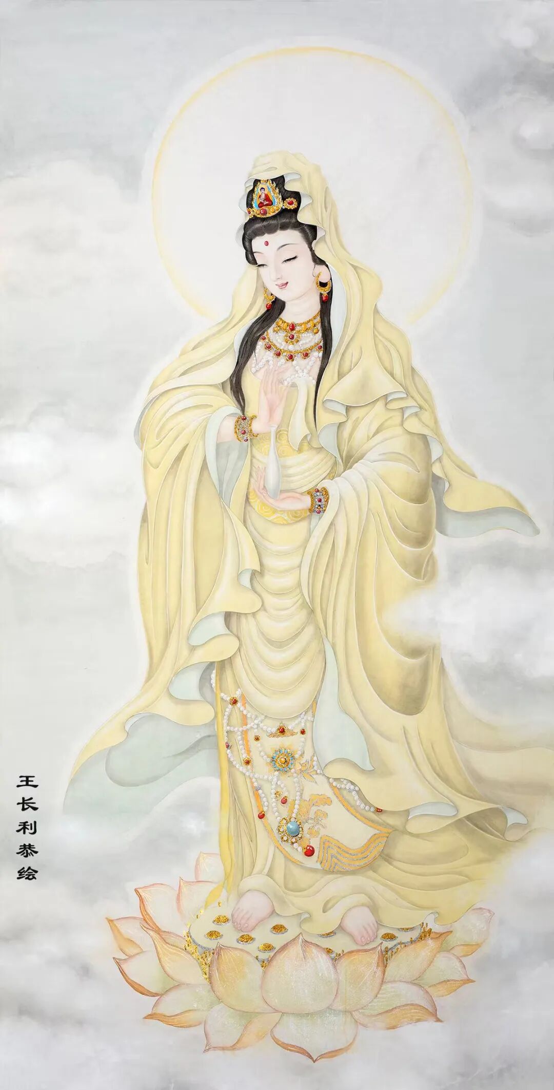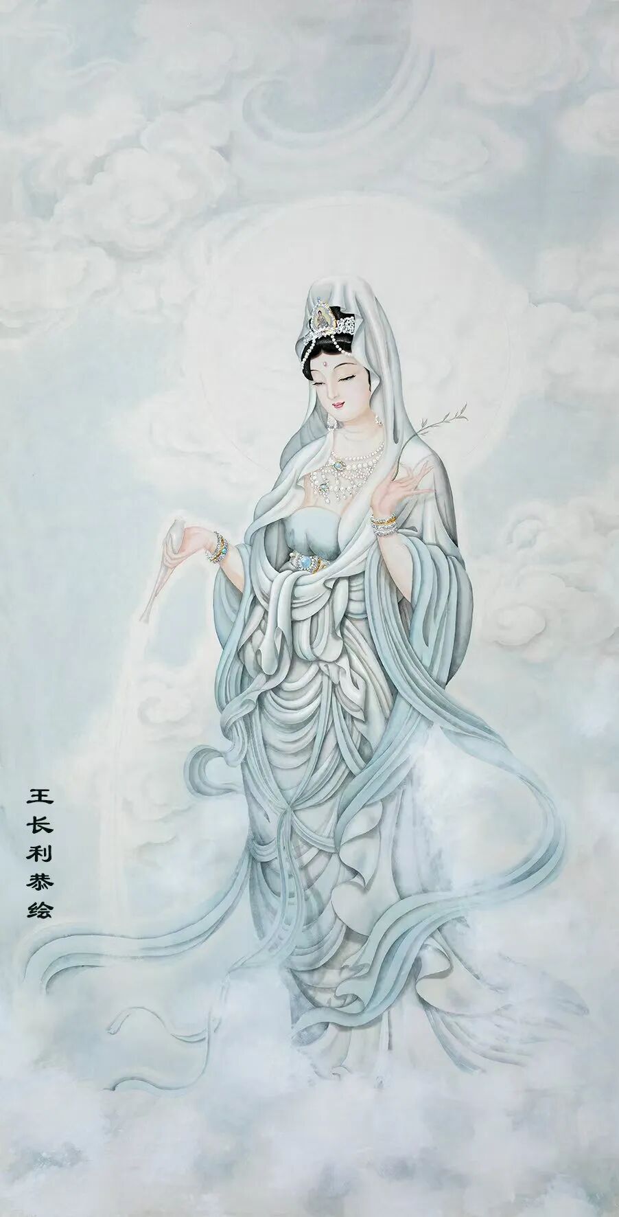 王长利老师的观音圣像慈容端丽,宝相庄严。宏伟壮观,栩栩如生。富丽清雅,瑞彩纷呈,衣袂飘举,线条灵动,具有“天衣飞扬、满纸风动”的效果,正所谓“曹衣出水,吴带当风”。极具盛世之大美。被宗教界赞誉为“古今圣像第一人。”他的巨幅佛像被上海静安寺、普陀山法雨寺,北京八大处灵光寺、德寿寺,河南少林寺,广东东华禅寺,九华山慧居寺、五台山普化寺,金华智者寺等诸多顶级寺庙珍藏,在寺庙永久供奉。世界最高的艺术殿堂法国卢浮宫和大英博物馆也都发出个人画展的邀请,在世界最高艺术舞台上展示东方艺术的风采。