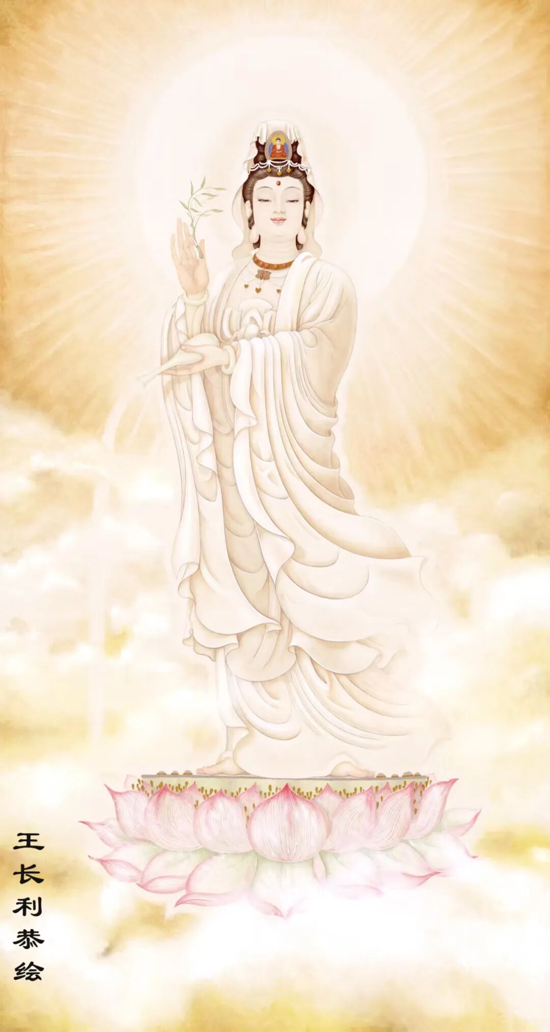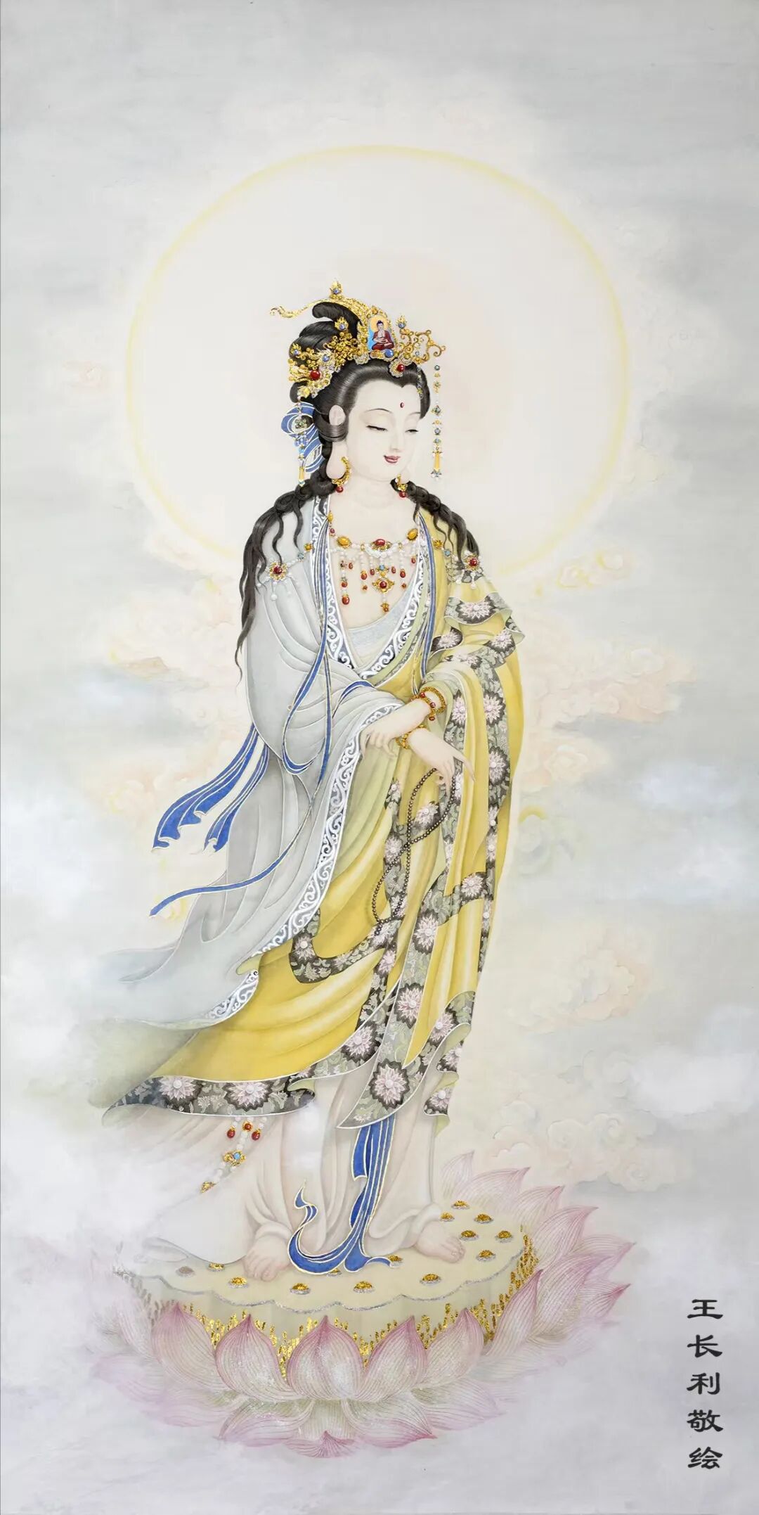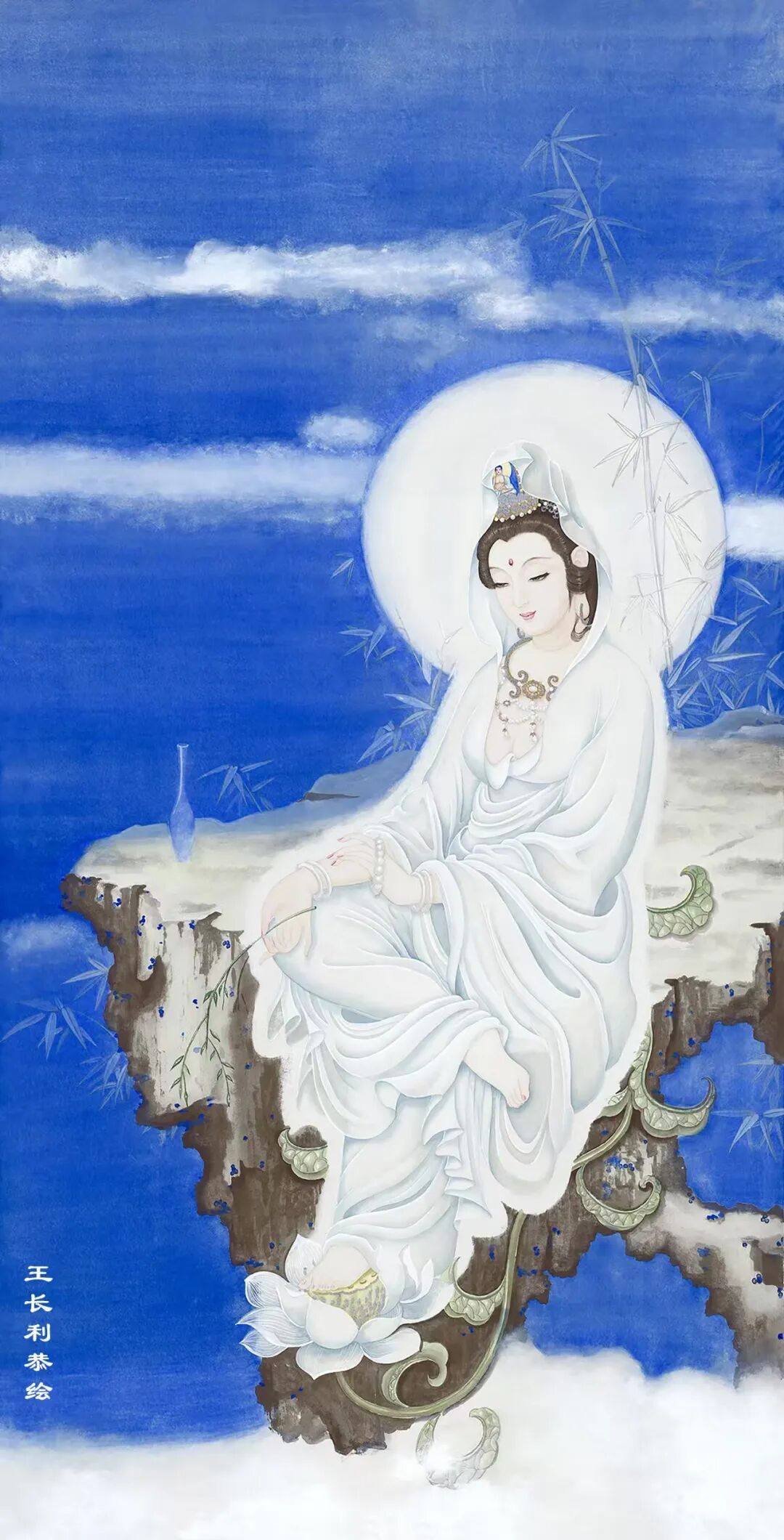 王长利老师的观音圣像慈容端丽,宝相庄严。宏伟壮观,栩栩如生。富丽清雅,瑞彩纷呈,衣袂飘举,线条灵动,具有“天衣飞扬、满纸风动”的效果,正所谓“曹衣出水,吴带当风”。极具盛世之大美。被宗教界赞誉为“古今圣像第一人。”他的巨幅佛像被上海静安寺、普陀山法雨寺,北京八大处灵光寺、德寿寺,河南少林寺,广东东华禅寺,九华山慧居寺、五台山普化寺,金华智者寺等诸多顶级寺庙珍藏,在寺庙永久供奉。世界最高的艺术殿堂法国卢浮宫和大英博物馆也都发出个人画展的邀请,在世界最高艺术舞台上展示东方艺术的风采。