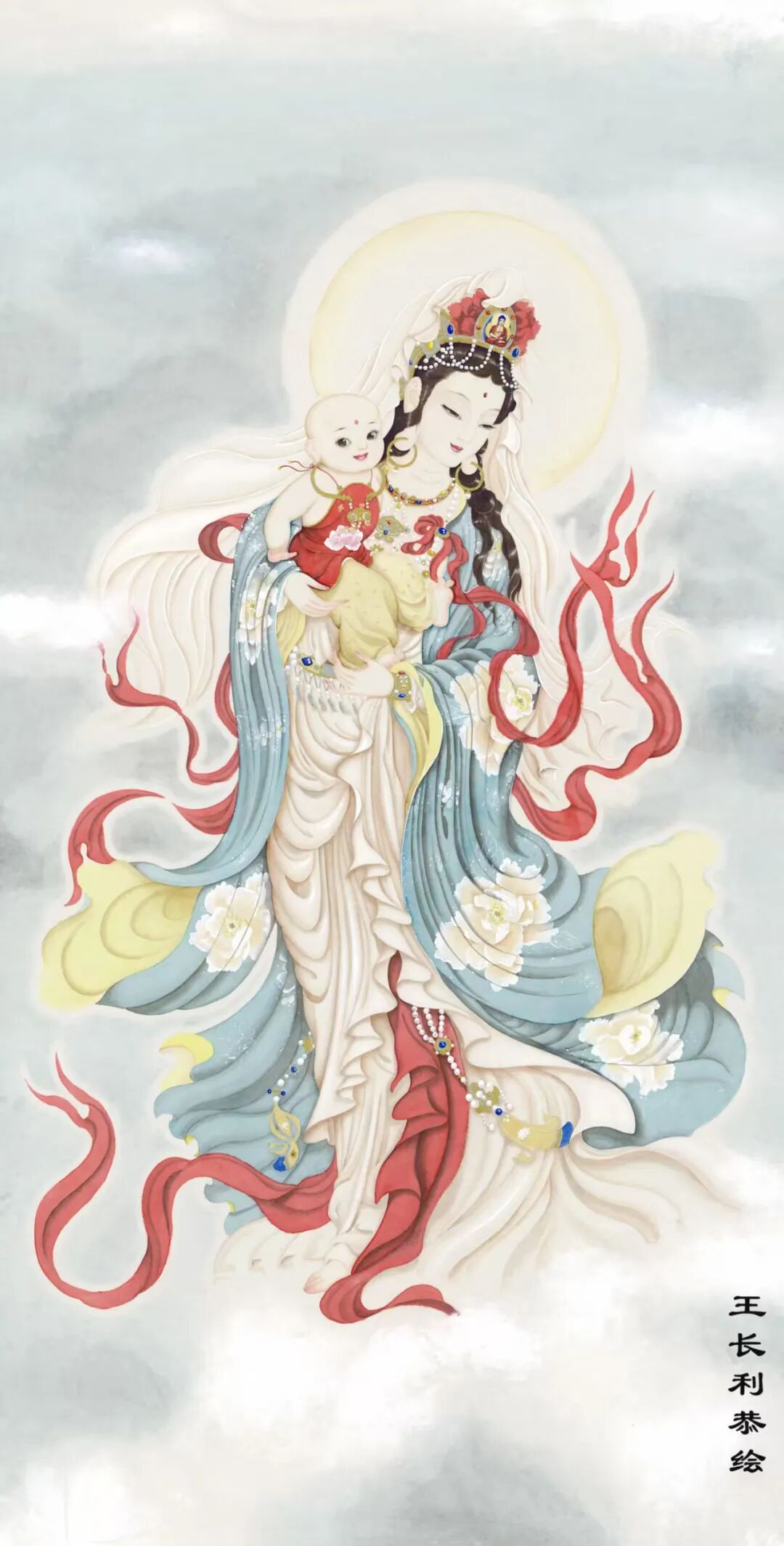 送子观音圣像,(画心高2.4米,宽1.2米)。供奉于广东东华禅寺。